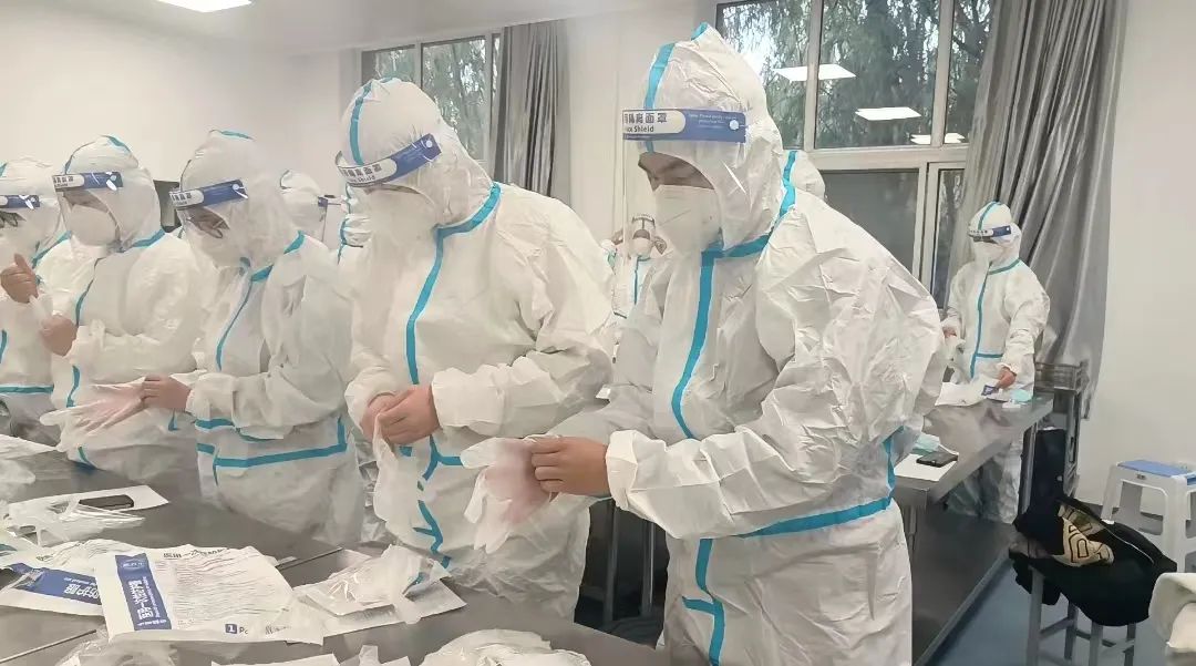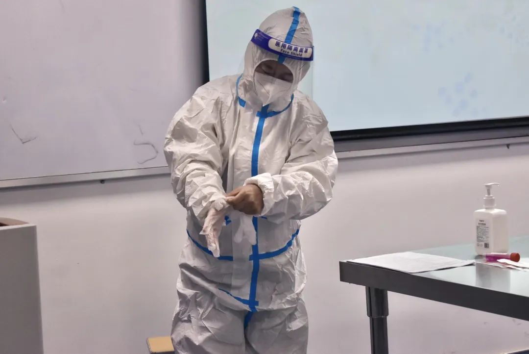 会议最后,主任带领大家进行穿脱防护服以及咽拭子的操作,并告诉同学们防护服及咽拭子采集这两项操作在核酸采样工作中非常重要,需要人人熟练掌握。同学们认真参与,并取得了良好的效果。