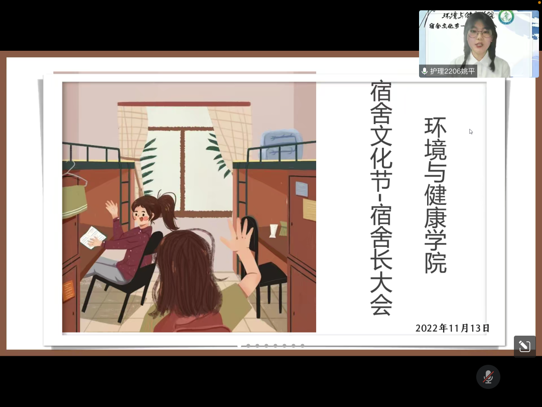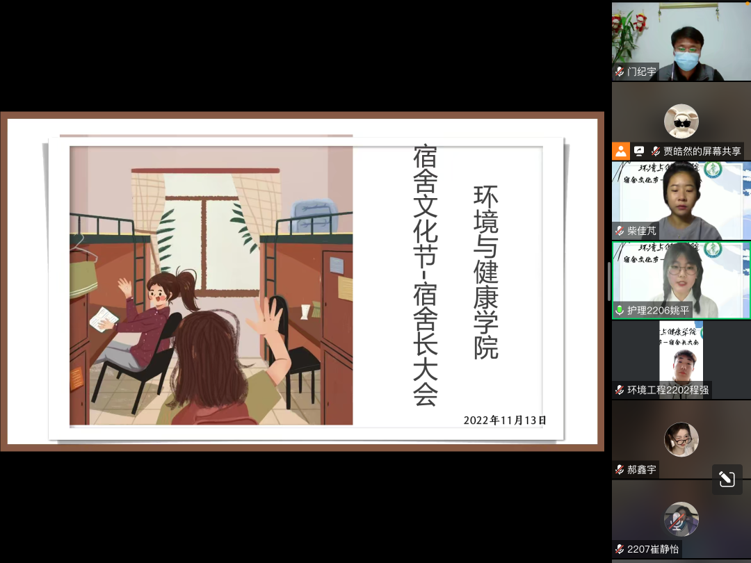 为加强学生宿舍管理,维护宿舍内部秩序,构建和谐友好的学生住宿氛围,11月13日晚,环境与健康学院举行线上宿舍长大会,参与本次会议的有环境与健康学院党总支书记门纪宇、环境与健康学院辅导员以及全体宿舍长。