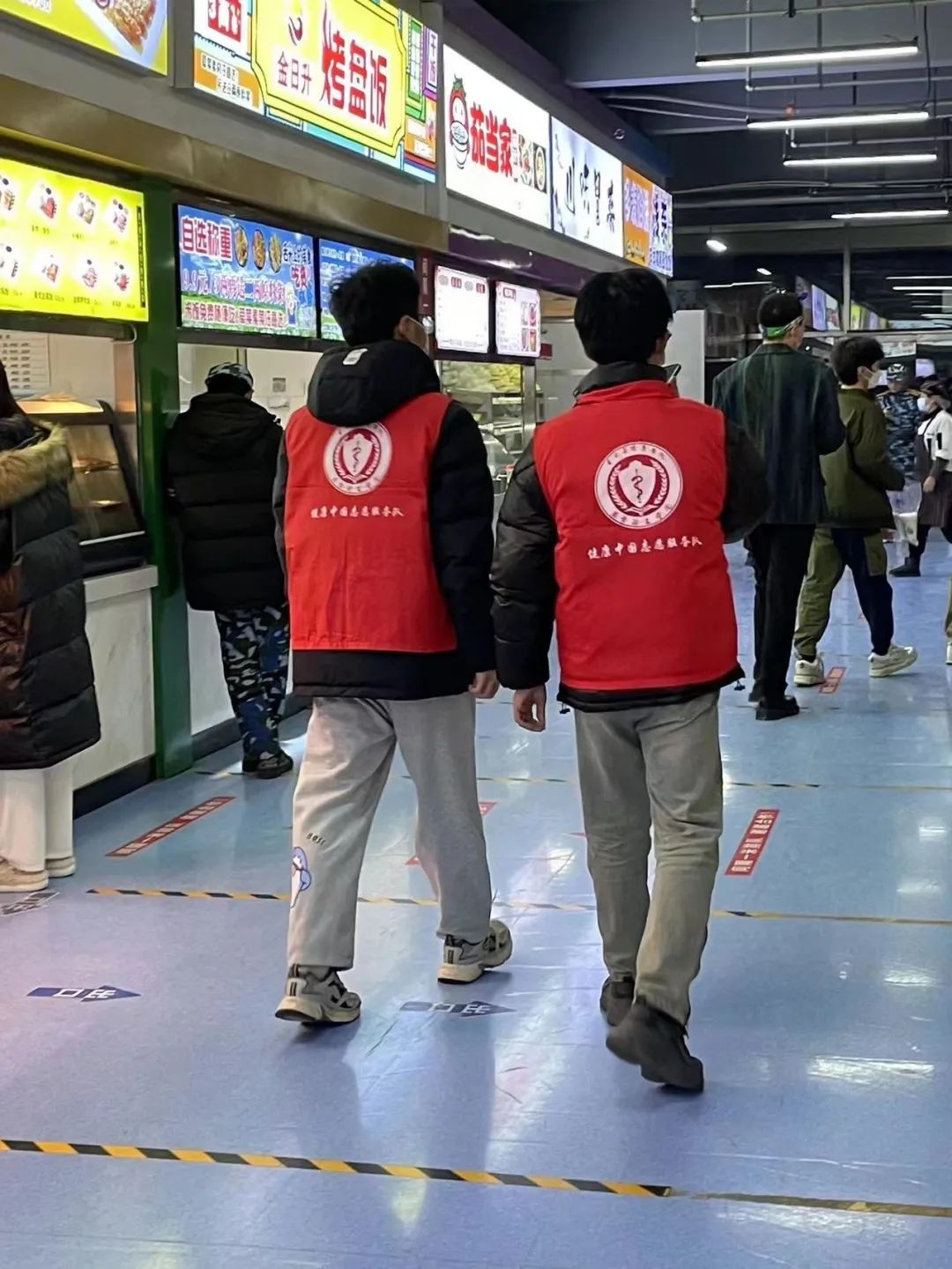 在餐厅,志愿者们身穿红马甲,在同学们走入食堂时提醒体温检测,确保体温正常,督促同学们保持一米安全距离,不断提醒就餐的同学进出食堂佩戴好口罩。他们以实际行动维护着同学们的安全。