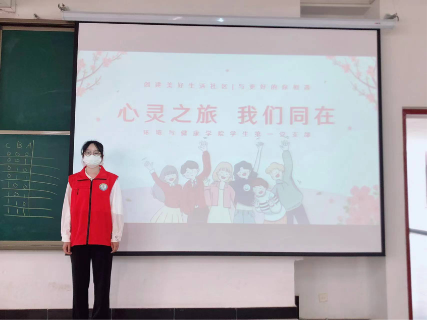 每年525日为全国大、中学生(包括中职学生)心理健康日,“5·25”的谐音即为“我爱我”,提醒大、中学生“珍惜生命,关爱自己”。此节日的核心内容为:关爱自我,了解自我,接纳自己,关注自己的心理健康和心灵成长,提高自身心理素质,进而爱别人,爱社会。特此,环境与健康学院学生第一党支部开展“心灵之旅,我们同在”主题活动。