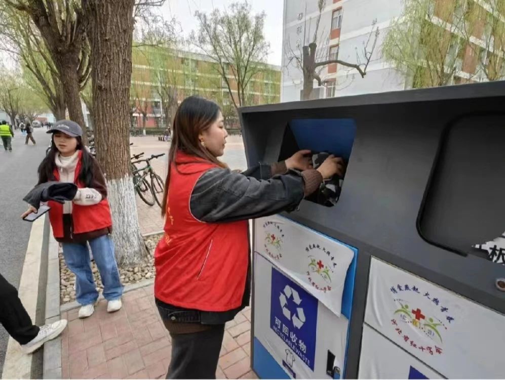 在活动开展过程中,同学们将各类回收物品打包好,如:废旧的衣物、纸箱等,有序地放进绿色回收垃圾箱内。随后,志愿者将收获满满的物品进行清点、分类、整理,将旧物赋予新的青春记忆,将温暖传递下去。