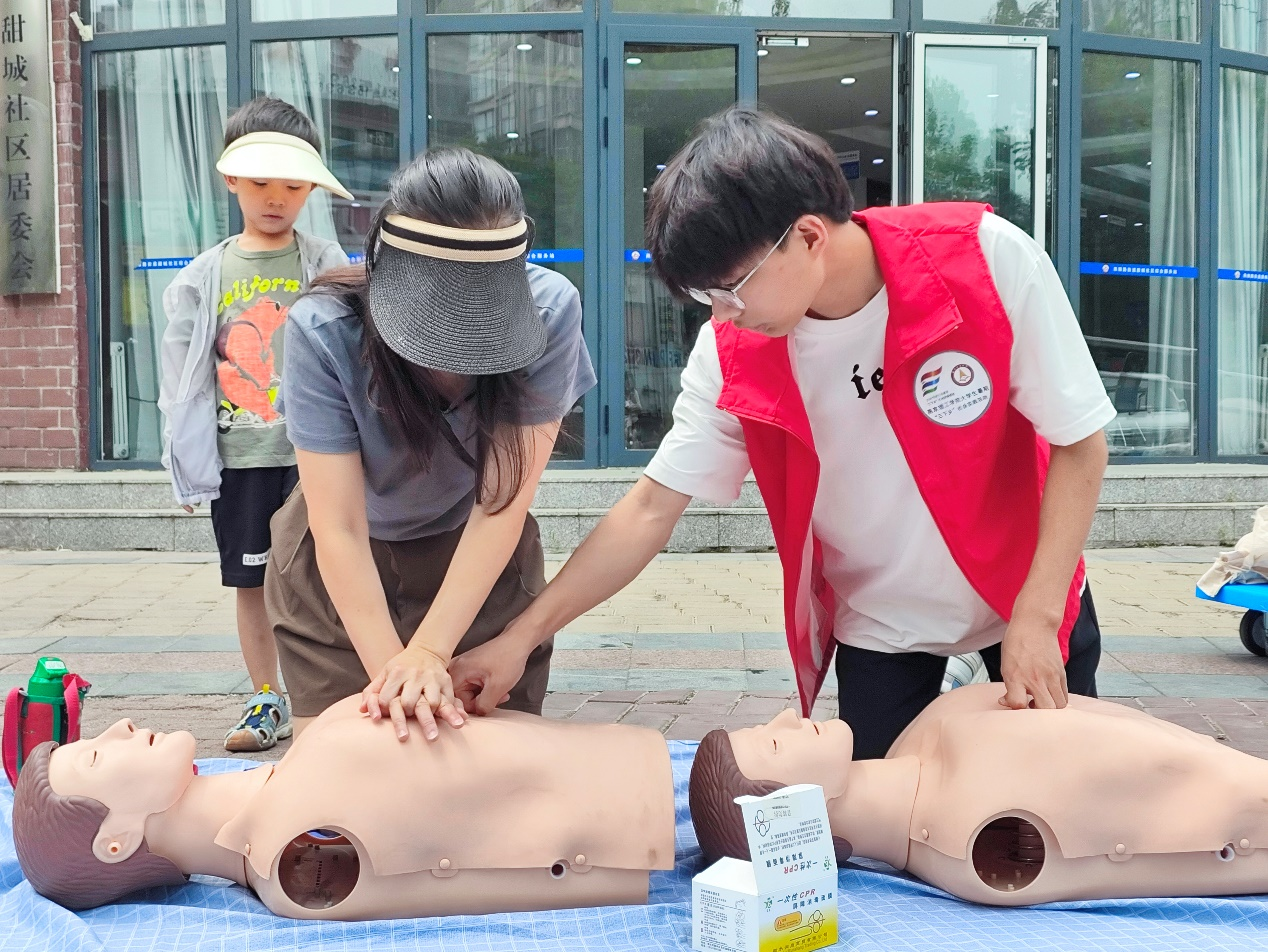 为深入学习贯彻习近平新时代中国特色社会主义思想,充分发扬新时代大学生志愿服务精神,发挥“人人学急救,急救为人人”理念在居民生命安全教育和社区安全建设中的积极作用,2024年7月5日,环境与健康学院健康中国志愿服务队前往燕郊经济开发区弘阳广场,甜城社区,林荫大道,鑫乐汇广场,天洋城广场,天洋城翰锦社区以及萌豚湾儿童游泳馆等地,开展为期15天的暑期“三下乡”社会实践活动。