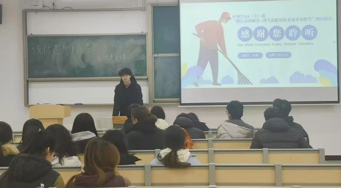为学习贯彻习近平总书记关于志愿服务的重要论述,引导团员青年传承和发扬“奉献、友爱、互助、进步”的志愿精神,坚持与祖国同行、为人民奉献,用实际行动为实现中国梦作出更大贡献,为中国特色社会主义志愿服务建设注入青春力量。环境与健康学院于12月开展了以“践行志愿服务—勇当志愿先锋 彰显青春担当”主题团课活动。此次活动由环境与健康学院23级各班团支书组织,同学们积极参与配合。