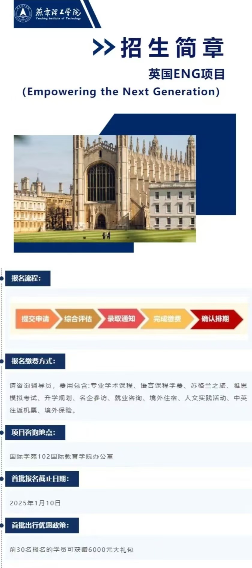 剑桥—青年领袖训练营为青年提供了短期的沉浸式研学平台,培养一批具有全球视野、跨文化交流能力和创新精神的高素质青年学子。学员们走进剑桥大学的课堂,与教授们进行面对面交流探讨,感受名校深厚的文化底蕴和前沿的学术成果。通过丰富的研学活动,深入了解英国的历史文化和社会风貌,拓宽全球视野。剑桥—青年领袖训练营项目的学员们走向世界、认识世界,进行一次学术与文化的深度探索之旅,更是一次自我挑战与成长的宝贵经历。
