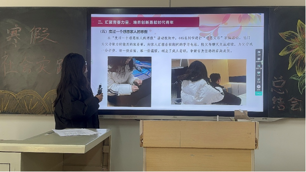 “度过一个感恩家人的寒假”主题由王彩燕同学主讲。她分享了寒假期间与家人相处的点滴故事,表达了对家人的感恩之情。她提到,寒假让同学们有更多时间陪伴家人,也让同学们更加珍惜这份亲情。通过感恩家人的实践,同学们不仅增进了家庭感情,也传承了中华民族的传统美德。她的分享充满了温情与感动,深深打动了在场的每一位听众。