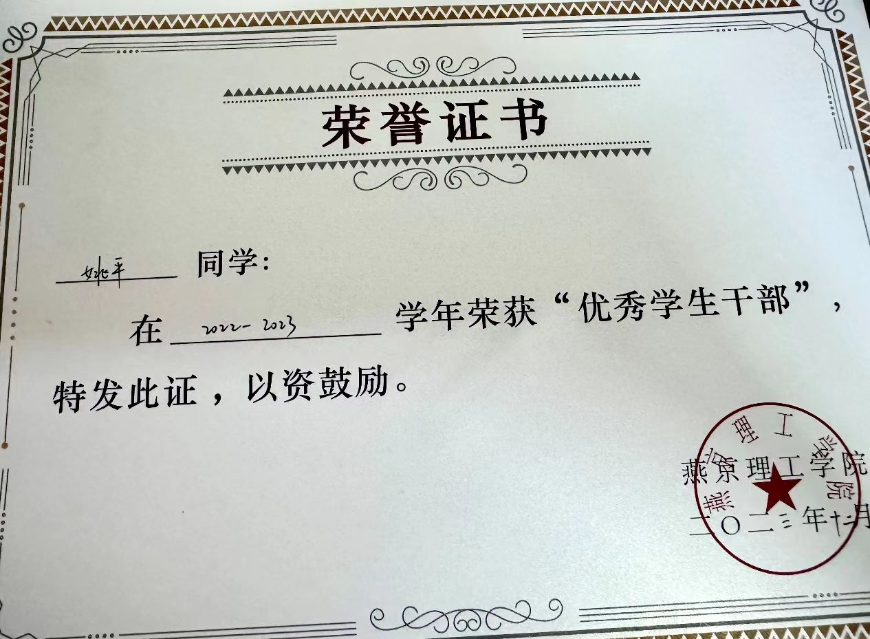 护理2206班姚平,共青团员,现任护理2206班团支书、燕京理工学院红十字会主任、环境与健康学院健康中国志愿服务队副队长。她心怀理想、勤奋学习,不断提升自身综合素质,曾荣获校级优秀学生干部、校级三好学生、校级奖学金、全国普通话二甲证书、红十字救护员证、全国计算机二级证书等荣誉。此外,她还获得廊坊市“优秀应急志愿者”、劳动之星、优秀共青团支部书记等称号,并在多项全国性竞赛中获“优秀志愿者”“优秀组织者”等表彰。
