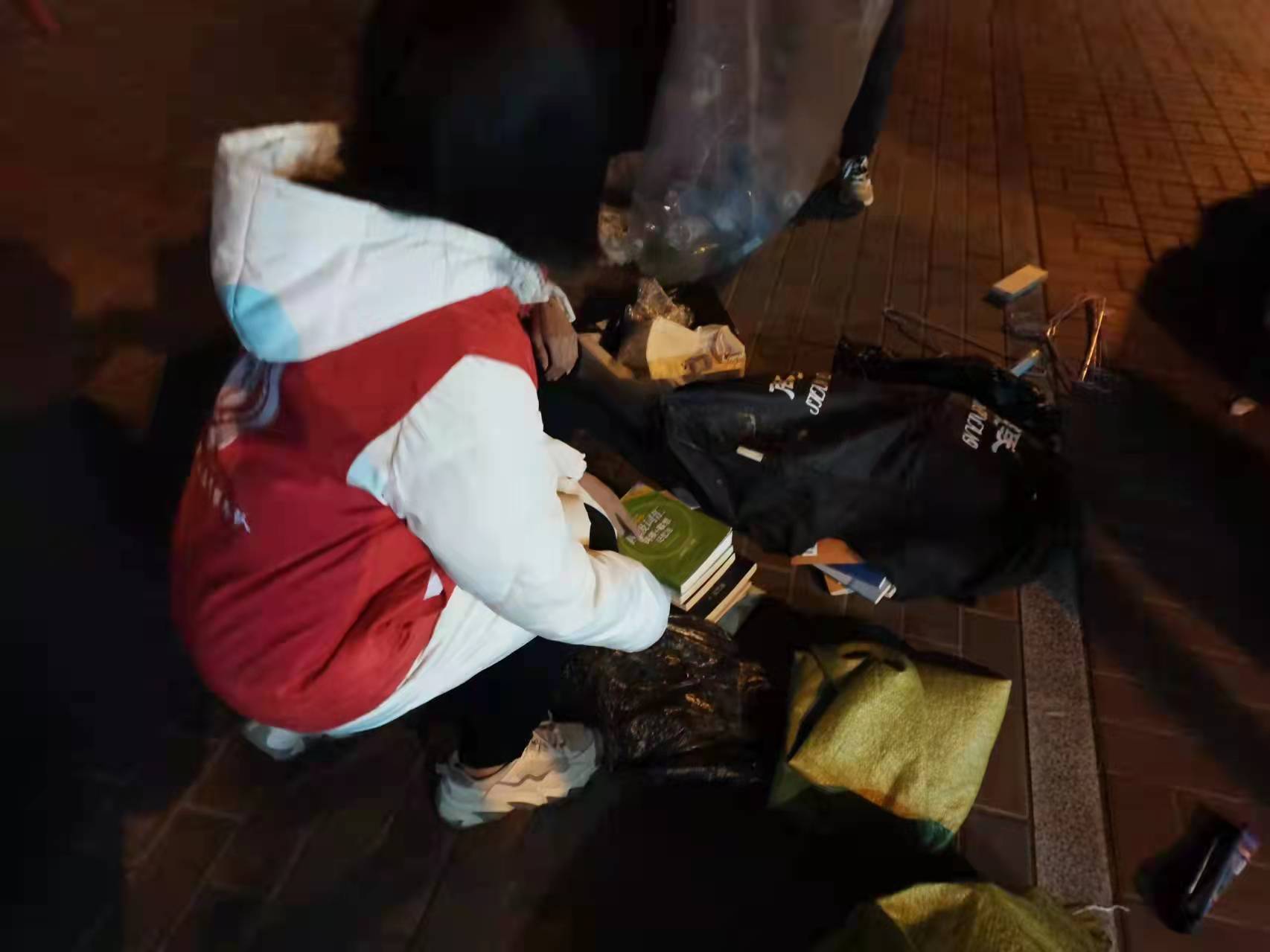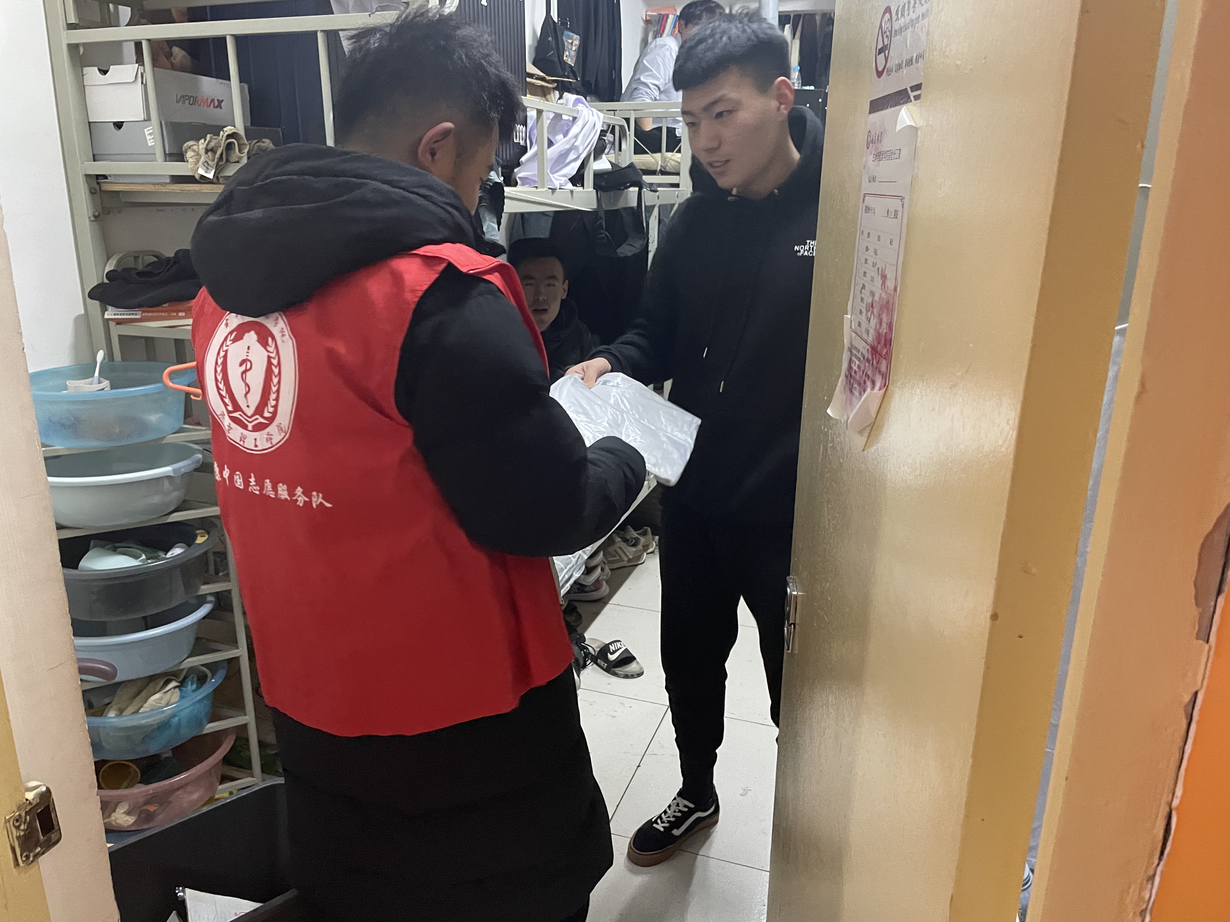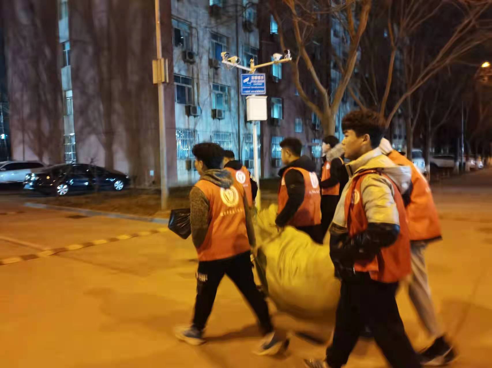 12月17日晚八点,志愿者们身着红马甲踏着忙碌的脚步奔走在各宿舍楼之间收取同学们的废旧物品。