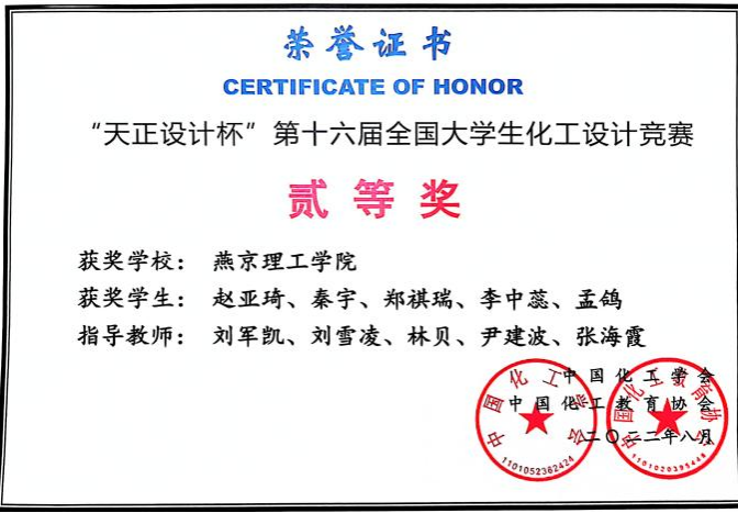 河北省化工设计竞赛荣誉证书因疫情原因尚未寄出