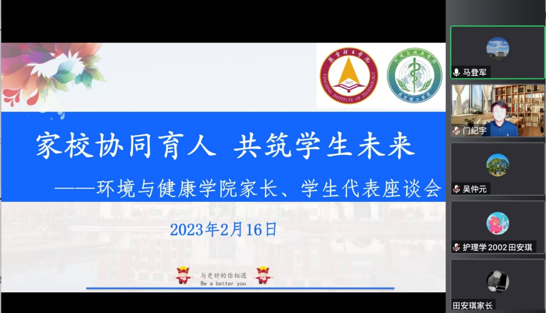 2月16日下午,环境与健康学院于腾讯会议线上召开家校协同育人·共筑学生未来座谈会。国际教育学院吴仲元院长、环境与健康学院马登军院长和门纪宇书记,全体辅导员老师及学院部分优秀学子和学生家长参加了此次线上会议。