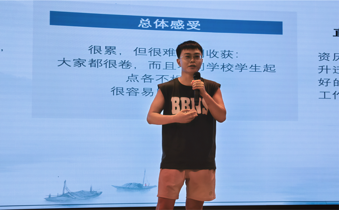 最后,优秀毕业生王帅从学习与生活的角度切入,以“思想、学业、竞赛、课外活动”四个方面为主题向同学们介绍了在大学生活中如何充实自己。他着重强调了竞赛和课外活动是大学生获取知识的重要途径,如大创项目、学科竞赛、大学生职业规划等,参加比赛可以帮助大家打开眼界,获得成就感。
