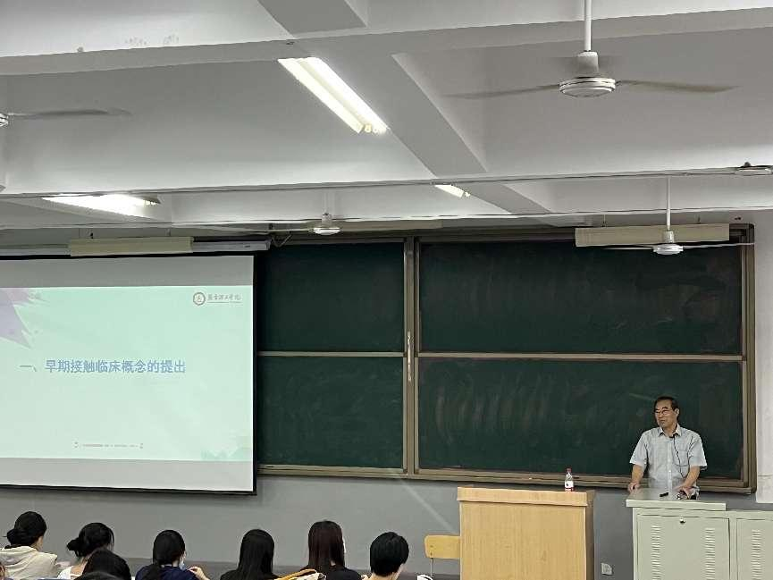 接着,王振方教授全面地向学生讲解了早期接触临床的概念、意义、形式和要求,通过“早临床、多临床、反复临床、持续临床”,达到医学生思维模式由重点思维向系统思维、分科思维向整体思维、慢思维向快思维的转变。王教授鼓励同学们充分利用暑期,根据自身情况及个人意愿进入各医疗机构积极见习,见习内容可从熟悉医疗机构环境、了解病人入院出院流程、科室查房、交接班等基础工作开始,逐步深入,也可进入到基层医院了解健康档案信息录入,“三高”疾病普查、老年病普查等,还可以进入养老院,了解老年人特点、常见老年病及特点、养老院护理工作内容等。