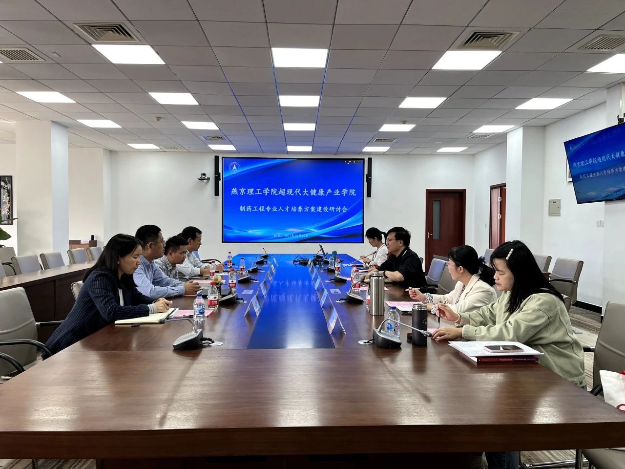 超现代大健康产业学院工作人员王晓雅老师、环境与健康学院副院长刘军凯及制药工程专业全体教师就专业培养方案修订及后续工作与四位专家进行深入的探讨和交流。
