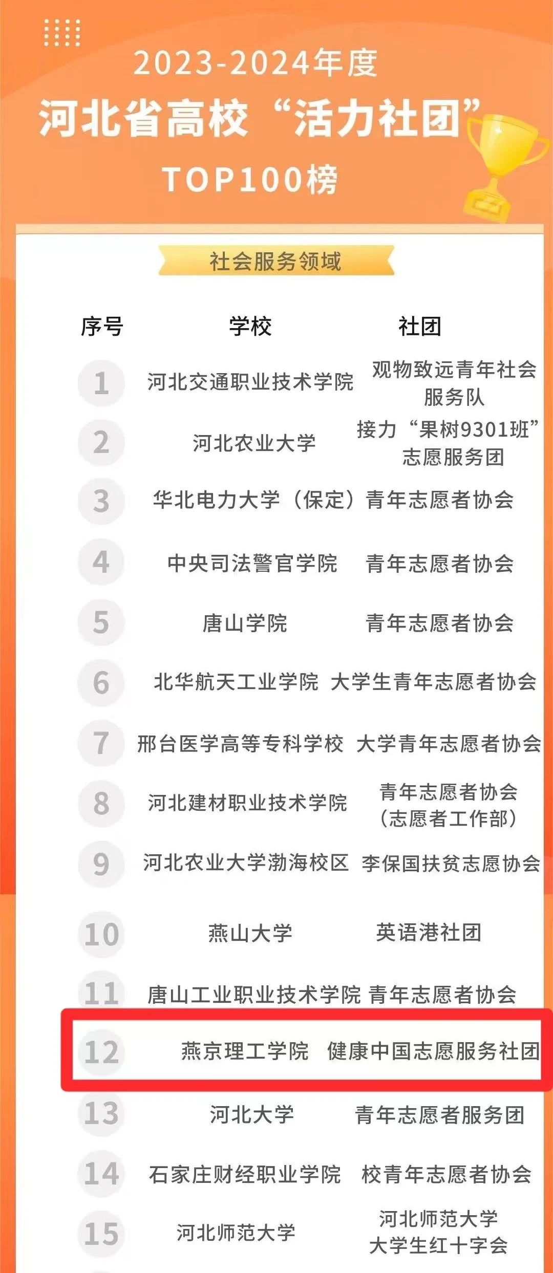 经推荐报名、相关负责人评审,我校环境与健康学院健康中国志愿服务队凭借出色的表现,进入了2023-2024年度河北省高校“活力社团”TOP榜前100,荣获第12名。