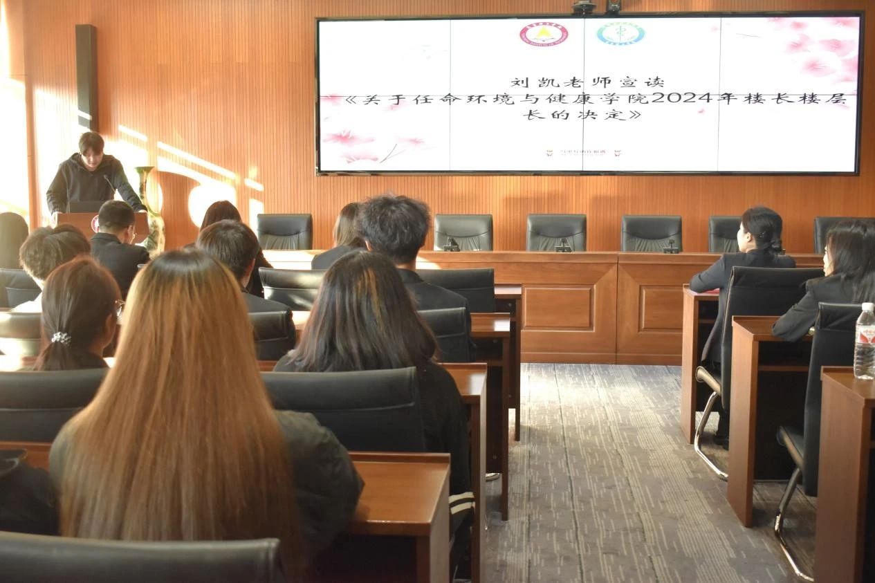 大会上刘凯老师宣读《关于任命环境与健康学院2024年楼长楼层长的决定》,本决定秉承公平、公正、公开的原则,经学生自主报名、民主推荐、资格审查、竞选答辩、组织考察,结合工作表现综合评价等环节,拟任命洪嘉淑等19人为环境与健康学院2024年楼层长。