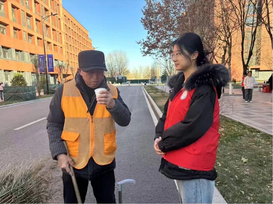 环卫工人在学校的每一个角落留下他们辛劳的背影。环境与健康学院健康中国志愿服务队于11月30日组织志愿者开展“给环卫工人送热茶传温暖”公益活动,纵使寒风凛冽却丝毫冷却不了志愿者们的热忱,她们穿梭在校园中,寻觅着环卫工人的身影,她们快步上前,带着最诚挚的敬意,将热气腾腾的茶递到他们粗糙的手中“您们辛苦了!”这一杯杯热茶宛如冬日暖阳温暖着每一位环卫工人的心。他们的脸上洋溢着质朴的笑容,此刻那热茶不仅仅是它本身凝聚着我们对环卫工人的一份份深切关怀,蕴含着我们对他们不辞辛劳的一点点诚挚感谢,更是对他们日复一日、不论严寒酷暑始终坚守岗位、用心装点校园的深情回馈。