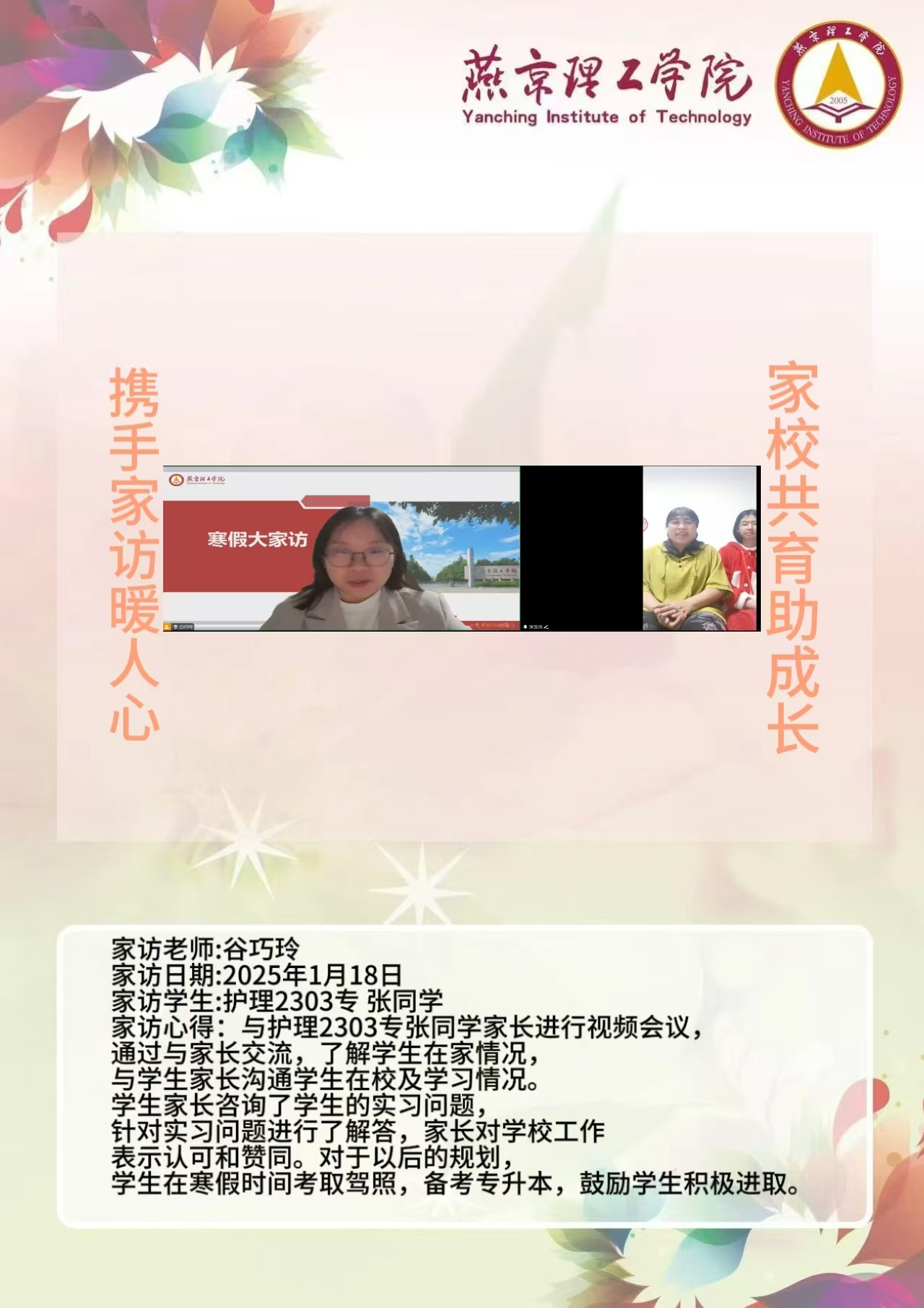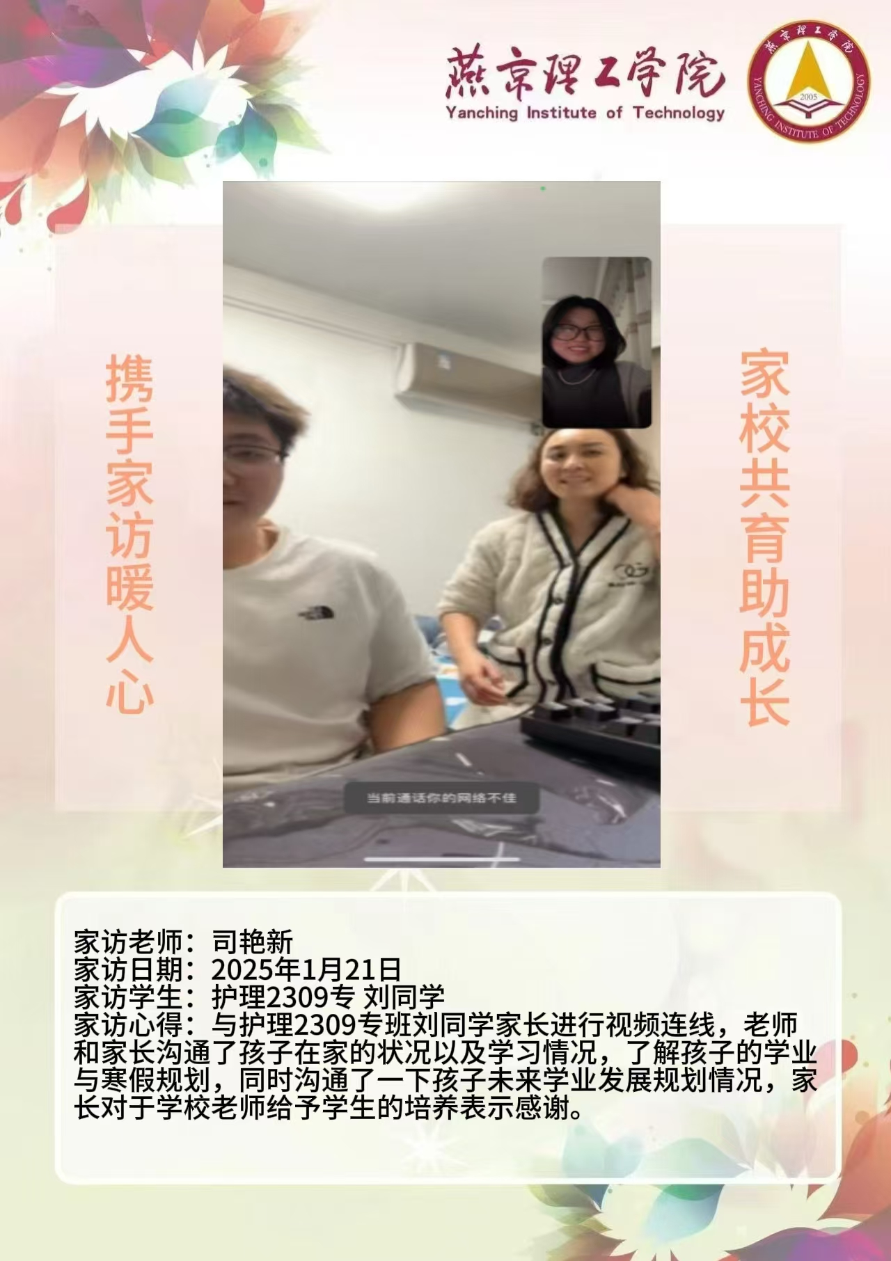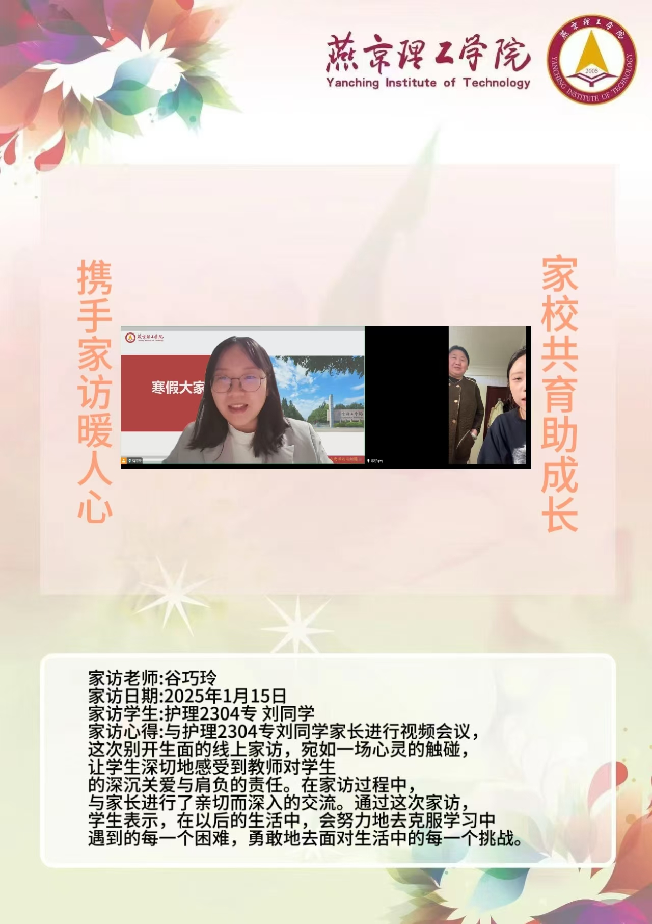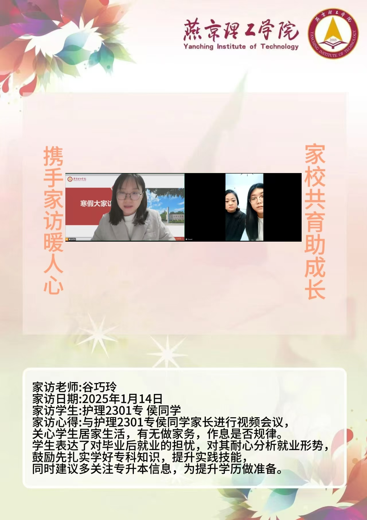 此次“大家访”活动是落实育人方针的关键举措,不仅搭建起家校沟通的稳固桥梁,更整合了校内外教育资源,构建起紧密联动的育人格局。未来,学院将持续深化家访成果,定期复盘经验,优化家访流程,确保家访工作常态化、高效化开展。同时,进一步挖掘家庭与社会资源,创新家校共育活动形式,打造更为完善的育人体系,全方位提升人才培养质量,为学生成长成才筑牢根基,在契合教育发展新形势的道路上稳步前行,培养出更多适应时代需求的优秀人才。