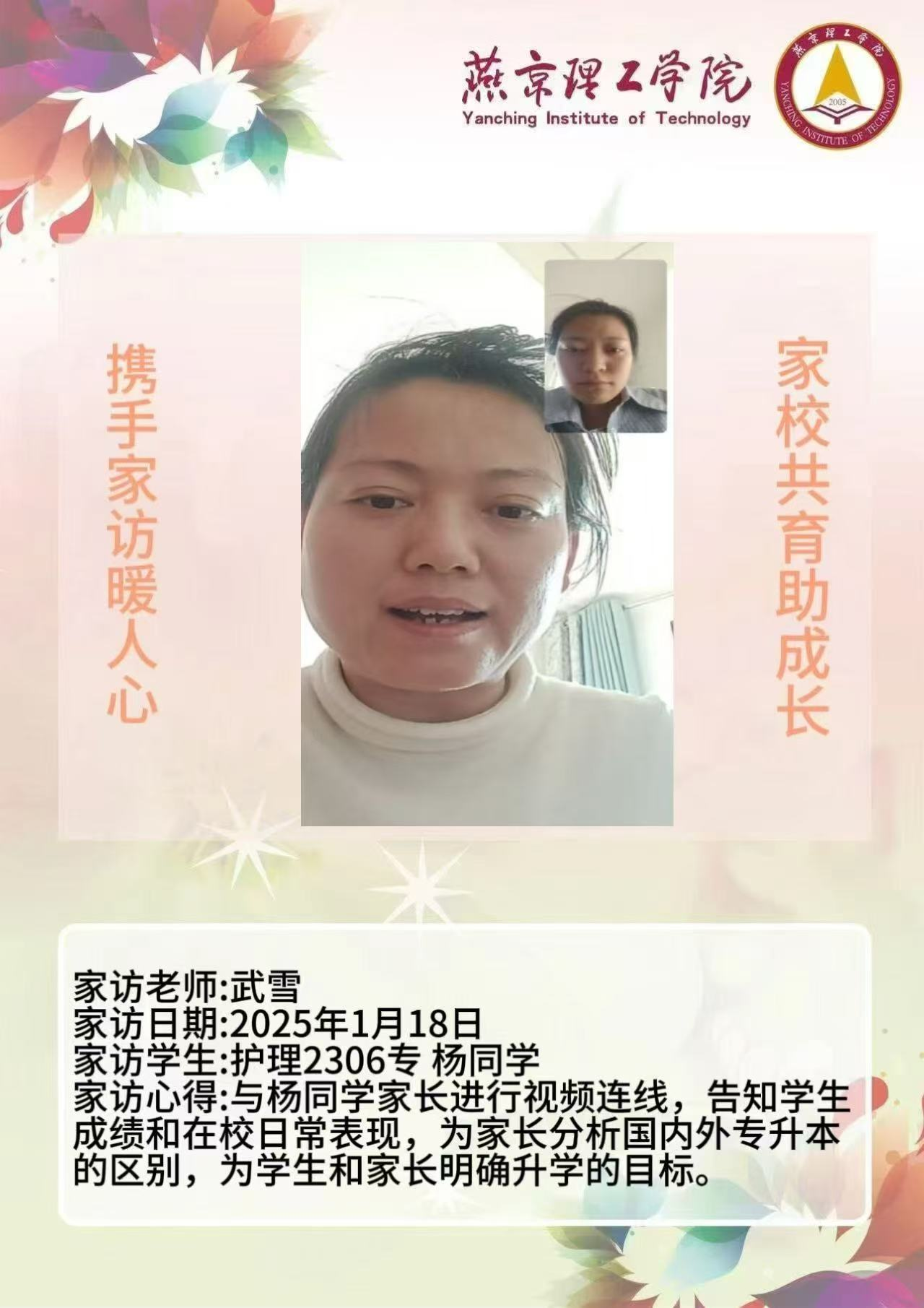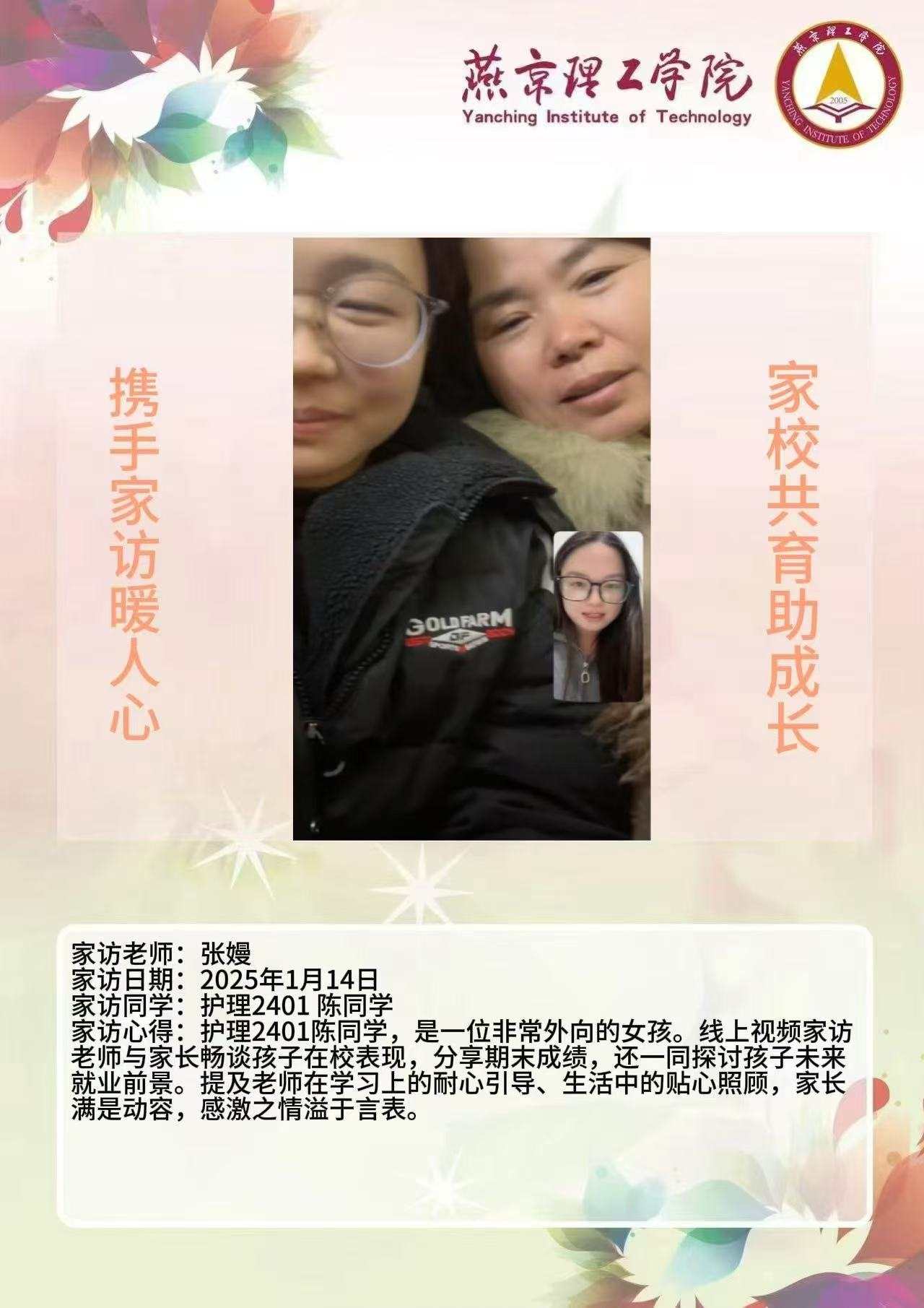 为深入贯彻全员育人、全过程育人、全方位育人的方针,切实提升人才培养质量,搭建学校与家庭之间稳固的沟通桥梁,整合校内外教育资源,形成紧密联动的育人格局,契合教育发展新形势与学校人才培育实际需求,环境与健康学院开展2025年寒假“携手家访暖人心 家校共育助成长”主题活动。