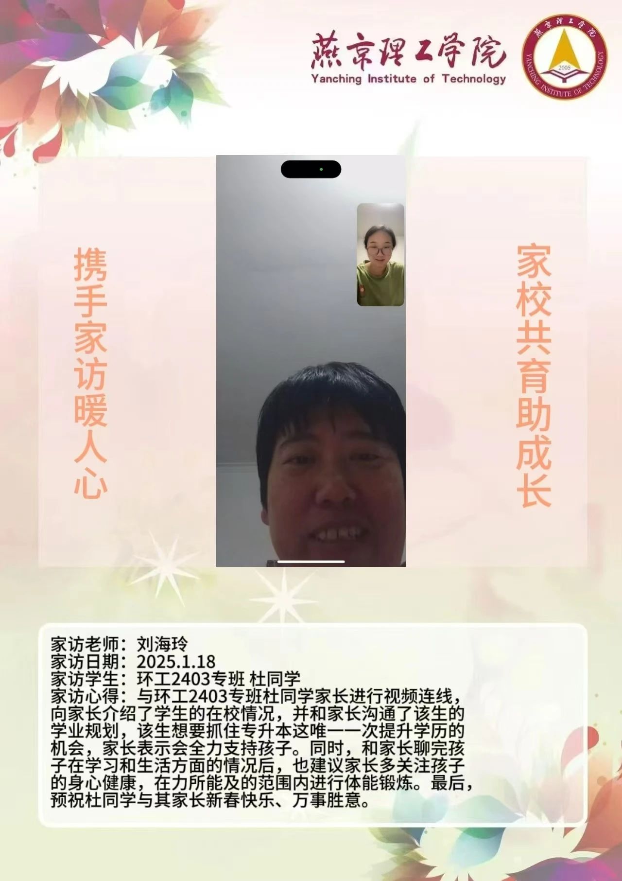 为深入贯彻全员育人、全过程育人、全方位育人的方针,切实提升人才培养质量,搭建学校与家庭之间稳固的沟通桥梁,整合校内外教育资源,形成紧密联动的育人格局,契合教育发展新形势与学校人才培育实际需求,环境与健康学院开展2025年寒假“携手家访暖人心 家校共育助成长”主题活动。