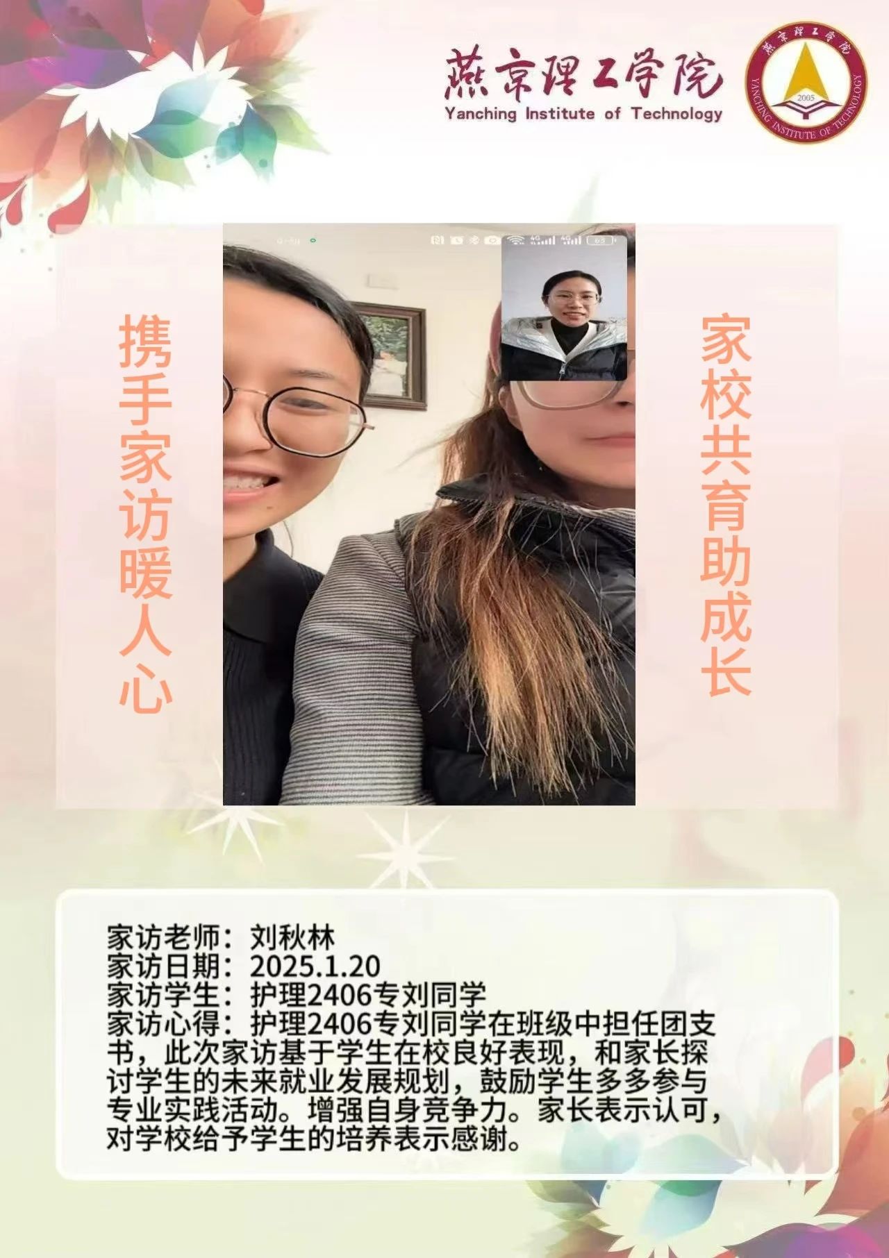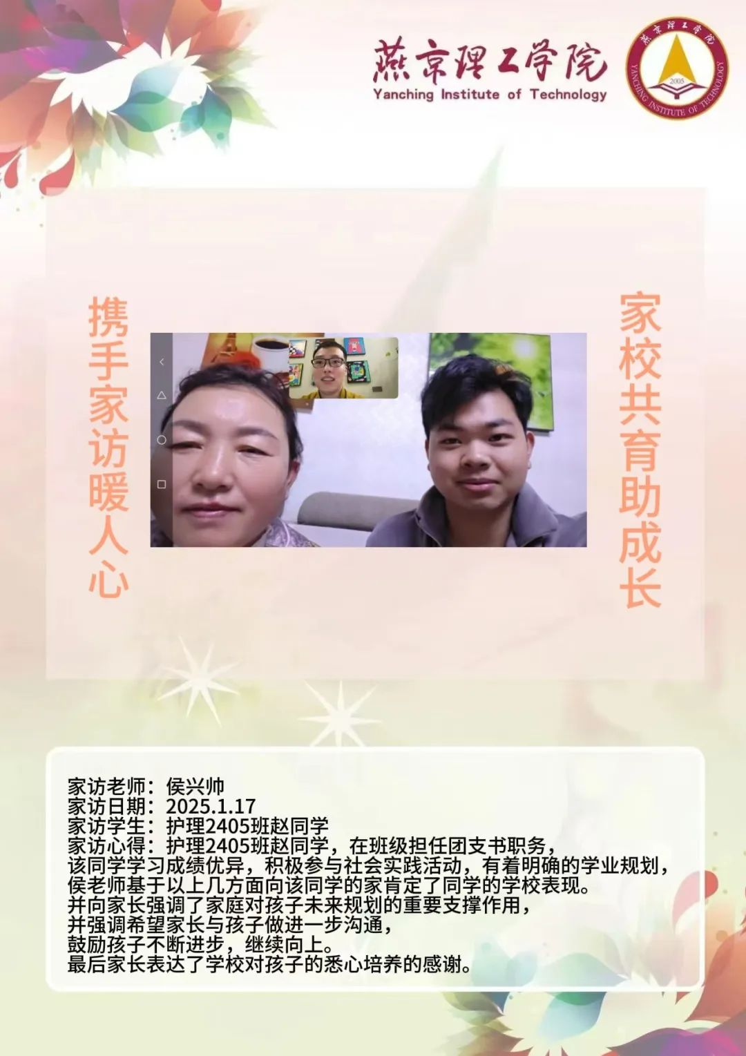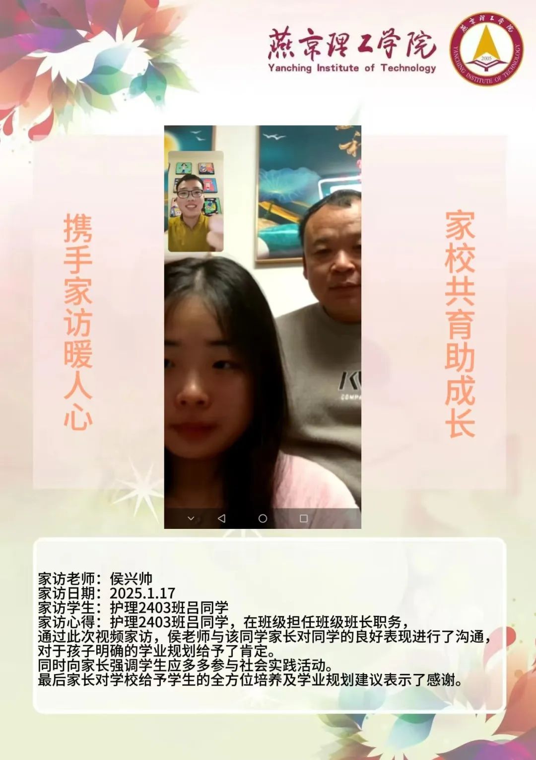 此次“大家访”活动是落实育人方针的关键举措,不仅搭建起家校沟通的稳固桥梁,更整合了校内外教育资源,构建起紧密联动的育人格局。未来,学院将持续深化家访成果,定期复盘经验,优化家访流程,确保家访工作常态化、高效化开展。同时,进一步挖掘家庭与社会资源,创新家校共育活动形式,打造更为完善的育人体系,全方位提升人才培养质量,为学生成长成才筑牢根基,在契合教育发展新形势的道路上稳步前行,培养出更多适应时代需求的优秀人才。