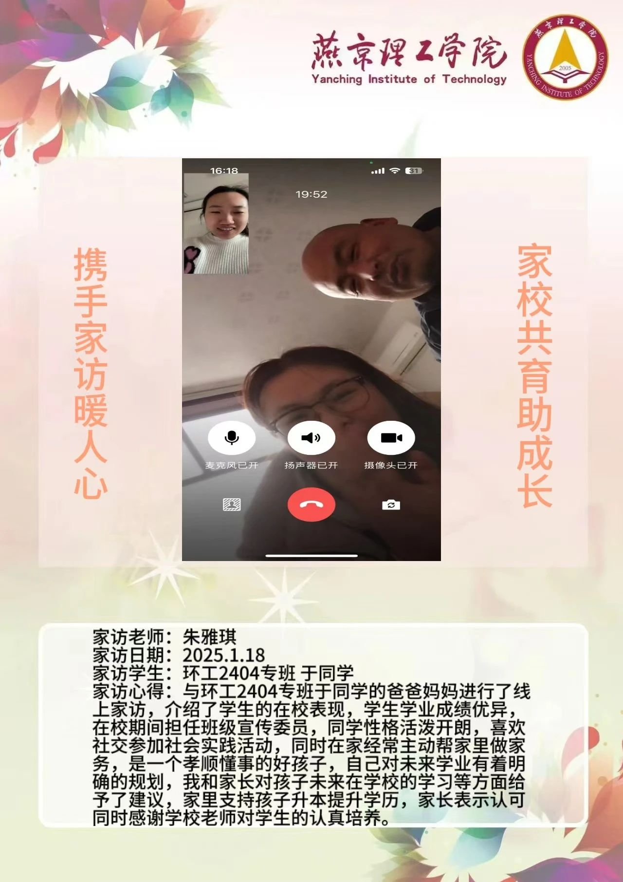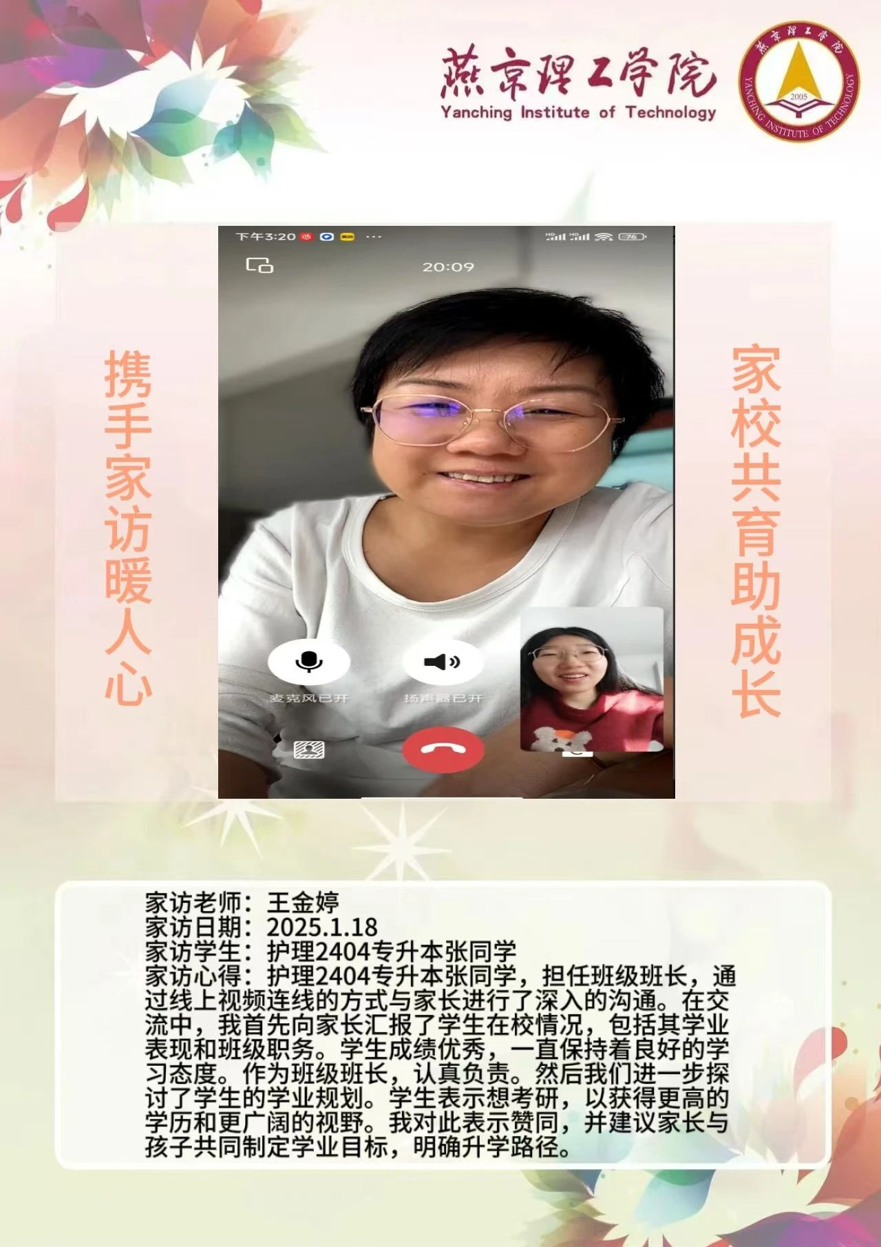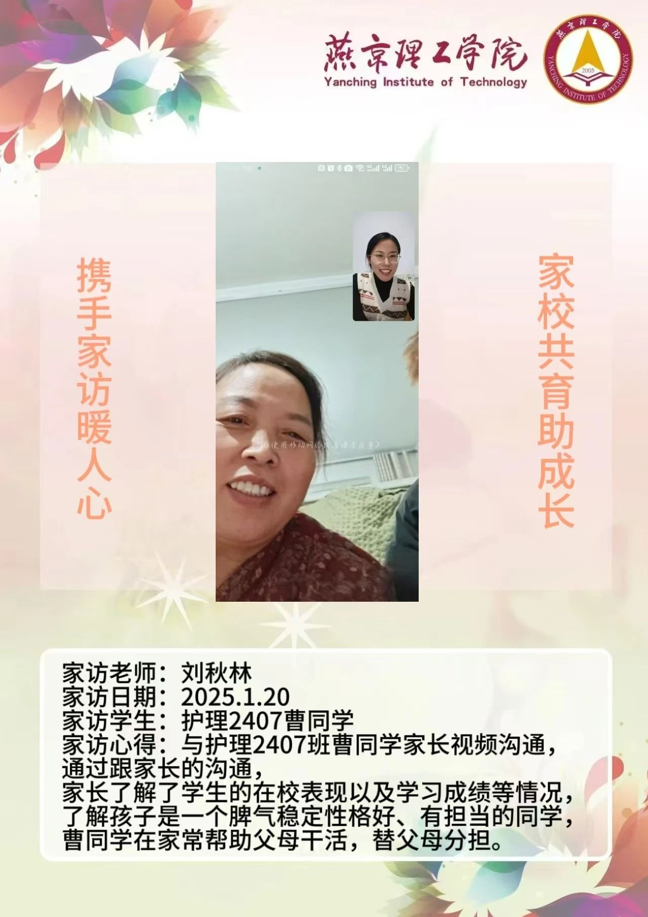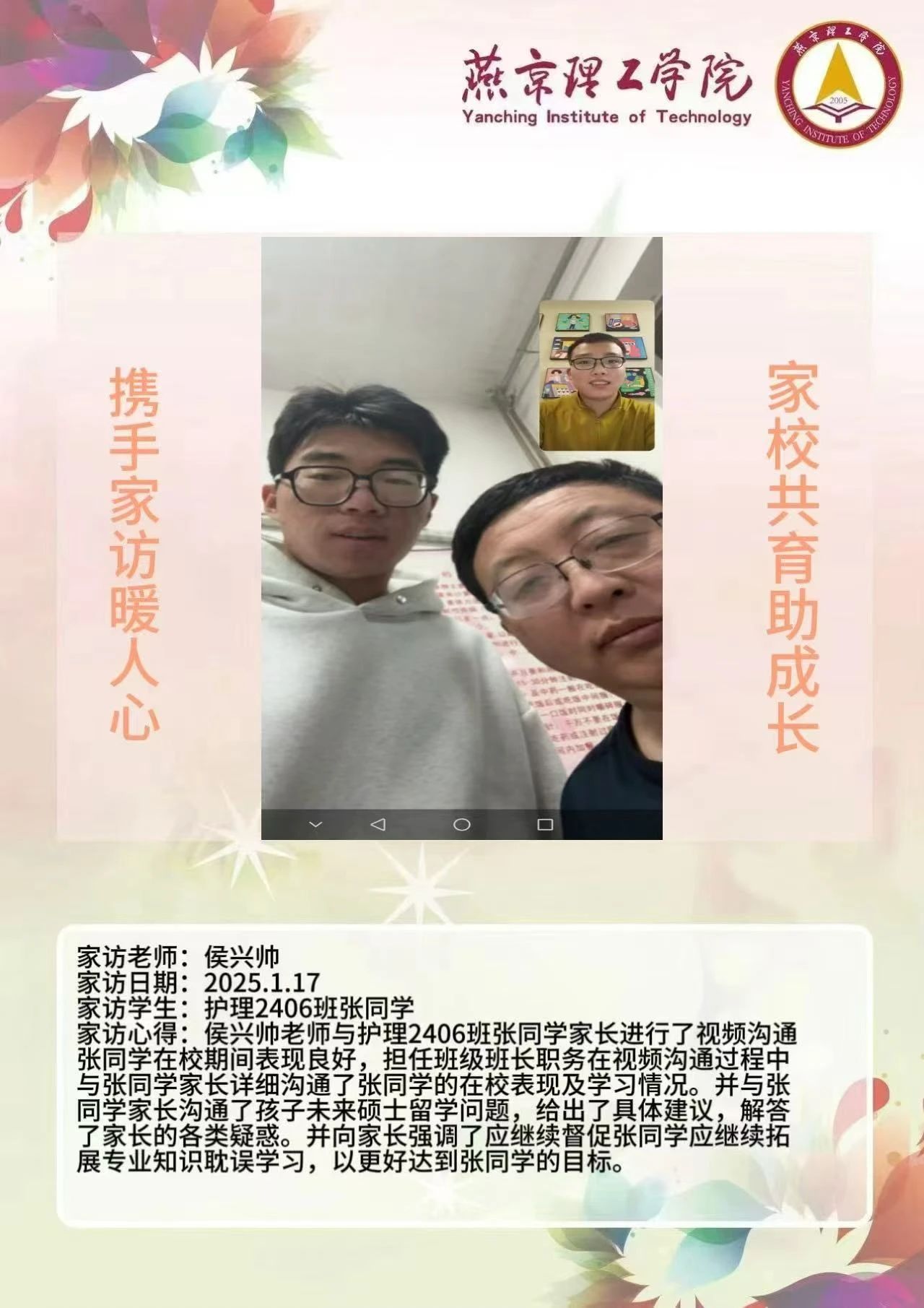 此次“大家访”活动是落实育人方针的关键举措,不仅搭建起家校沟通的稳固桥梁,更整合了校内外教育资源,构建起紧密联动的育人格局。未来,学院将持续深化家访成果,定期复盘经验,优化家访流程,确保家访工作常态化、高效化开展。同时,进一步挖掘家庭与社会资源,创新家校共育活动形式,打造更为完善的育人体系,全方位提升人才培养质量,为学生成长成才筑牢根基,在契合教育发展新形势的道路上稳步前行,培养出更多适应时代需求的优秀人才。