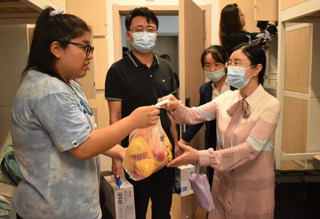 迎新活动结束之前,由尹丽娟院长和门纪宇书记带领辅导员老师到新生宿舍送水果、牛奶,并送去学院老师对于2021级新生的祝福,让2021级新生充分感受到学院老师的关心,尽早适应新校园新环境,成为一名优秀的燕理人。