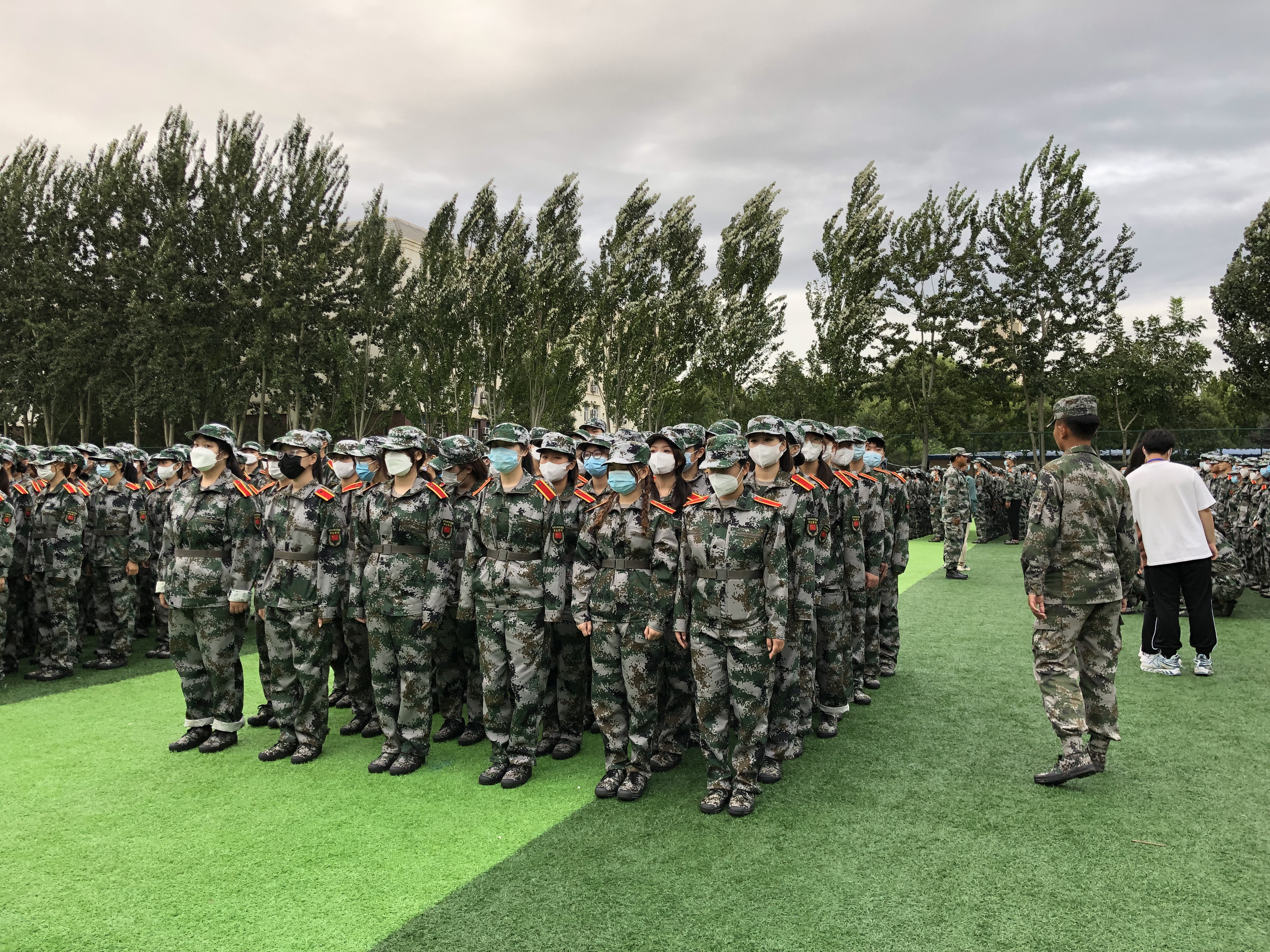 教官手把手教,学生认真地学,在军训队列中,方队整齐,精神饱满,步伐矫健、口令准确、声音嘹亮。军训中学会的东西将会使他们终身受用。