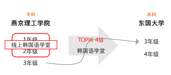 海外深造定向班采用小班式教学,全面提升学生英语或韩语应用能力、专业理论知识及综合素质水平。通过统招录取的学生以申请考核制方式进入定向班,完成本校阶段的学习后,可直接对接合作院校专升本本升硕课程。