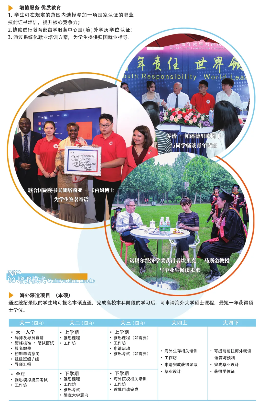 优化学生学术背景,学生可在规定的范围内选择参加一项国家认证的职业技能证书培训,提升职业技能,为申请海外院校做准备;国际活动、公益活动及学科竞赛等,旨在培养高素质人才,优化学生简历背景,全面提升名校申请竞争力。