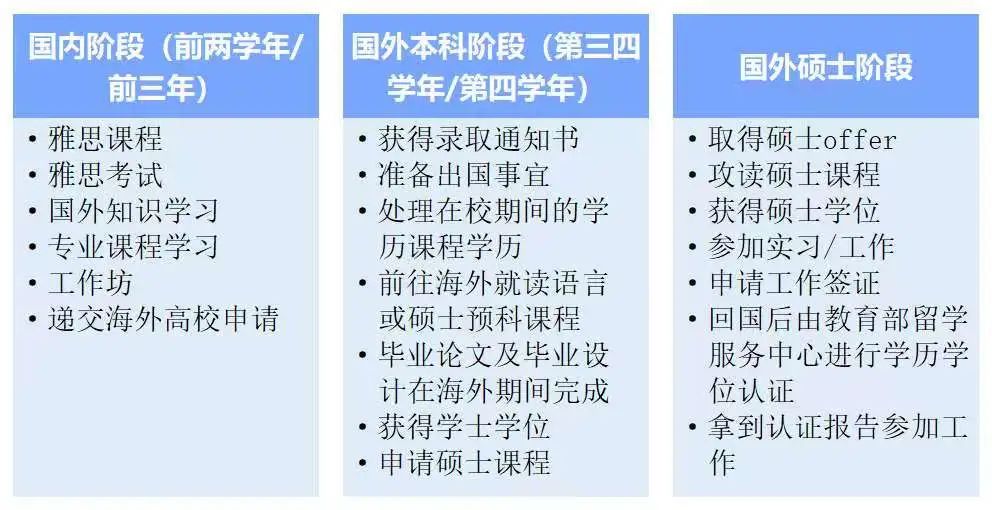 (2) “2+2+X”本硕直通 国内高校学习2年,国外高校学习2年后,获得国外高校学士学位,可直接申请国外硕士课程,最短1年获得硕士学位。