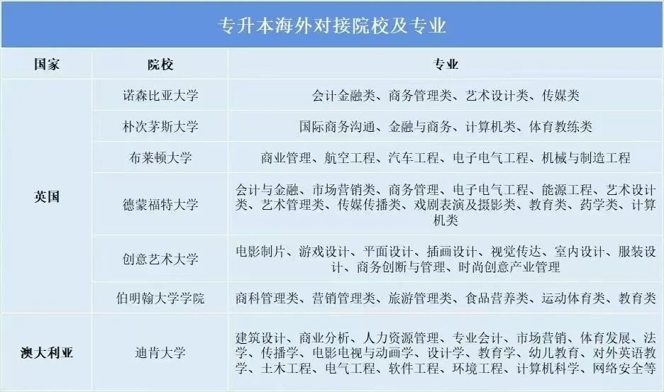 统招录取的学生通过海外深造专硕直通“专升本升硕”培养模式,完成国内高校专科学业后,衔接海外大学1-2年的本科课程,随后可申请升读海外大学硕士课程,满足学位授予条件者可获得海外大学学士学位和海外大学硕士学位。