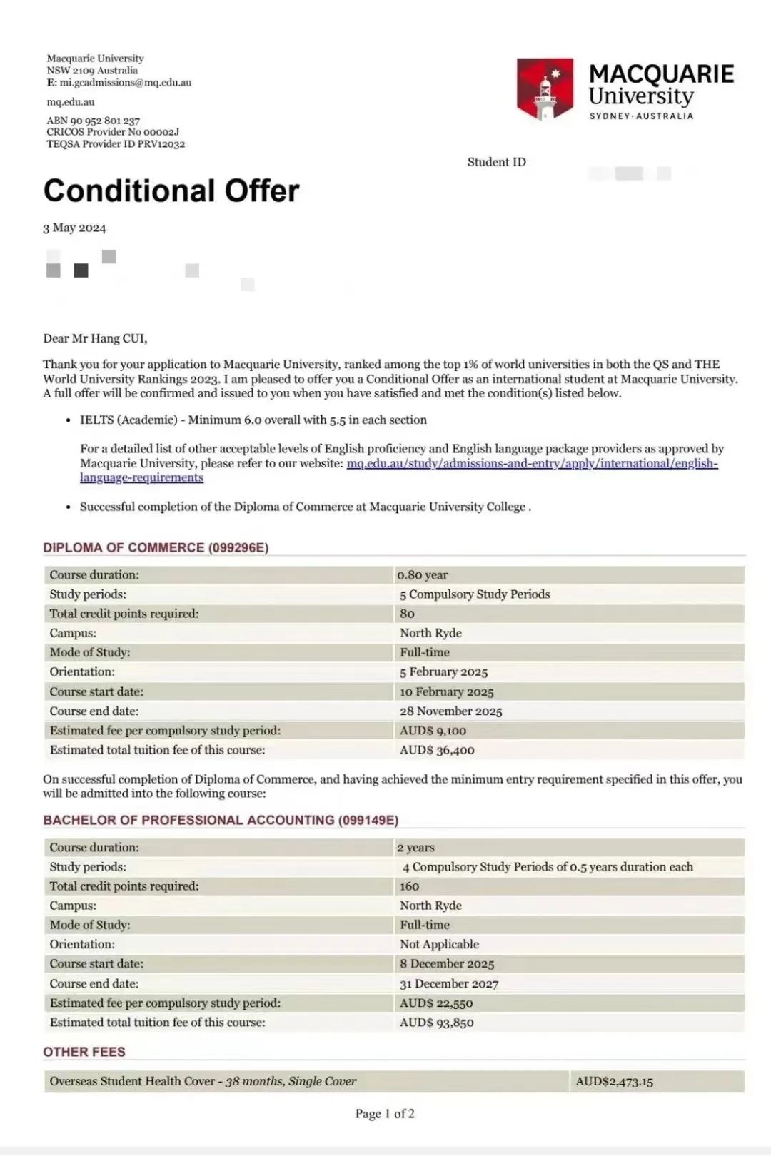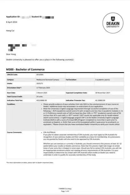 现已收到麦考瑞大学、迪肯大学唐道克理工学院offer