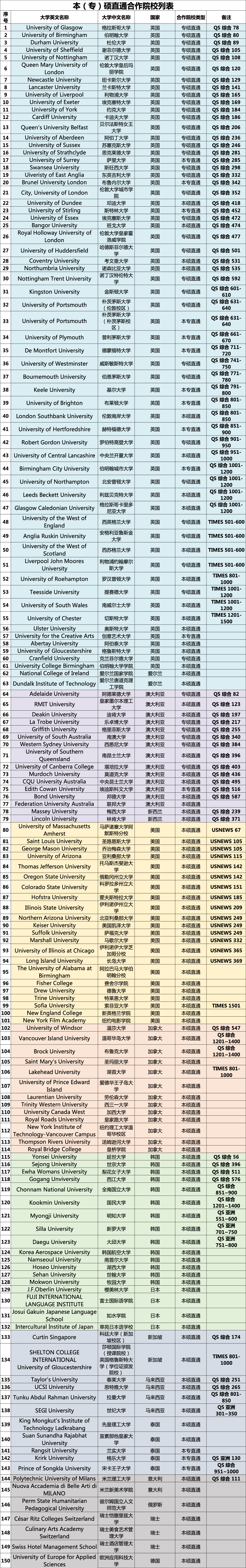 1.高质量定向深造奖学金覆盖院校:英国朴茨茅斯大学(伦敦校区)、美国索菲亚大学、麻省理工学院 、斯坦福大学 、哈佛大学、加州理工学院、剑桥大学、牛津大学、伦敦大学学院、帝国理工学院、芝加哥大学、苏黎世联邦理工大学、耶鲁大学、加州大学伯克利分校、普林斯顿大学等。(其余高质量定向深造奖学金覆盖院校由国际教育学院根据实际情况判定)
