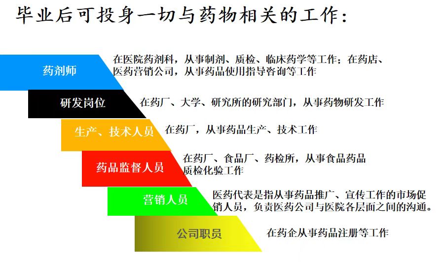 药剂师——在医院药剂科,从事制剂、质检、临床药学等工作;在药店、医药营销公司,从事药品使用指导咨询等工作