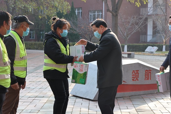 11月17日上午,校领导杨庚宇、刘元园、宋伟、赵鹏一行代表学校看望慰问坚守在校园一线的保安员、保洁员、食堂工作人员和校医务室人员等服务保障人员。后勤资产处、安全工作处相关负责人陪同参加慰问活动。