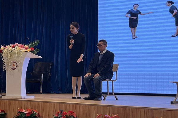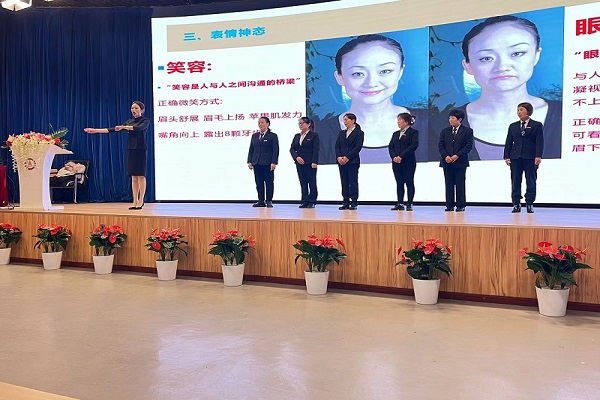 培训内容涵盖仪容仪表、形体仪态、表情神态、服务礼仪等,ACIC国际注册礼仪训师、燕理16级毕业校友孙蕾讲师,现场示范,带领大家一起做规范动作,一曲《你笑起来真好看》的手语舞,点燃全场,大家纷纷模仿,绽放最美笑容。