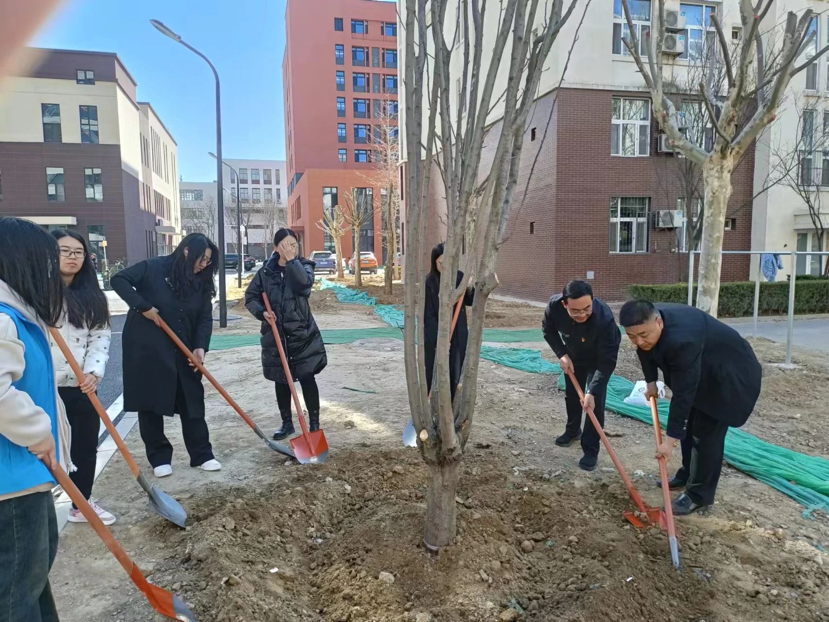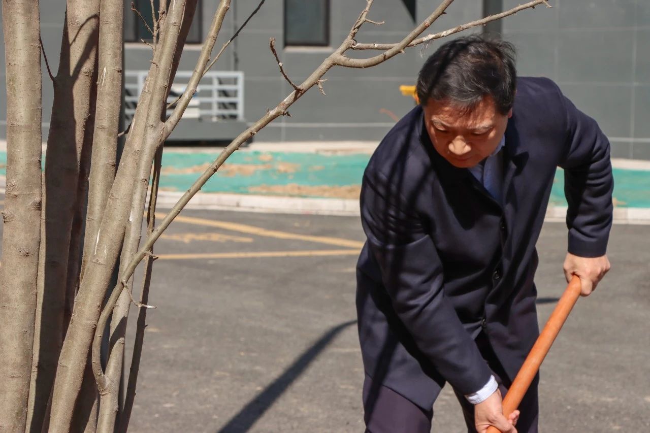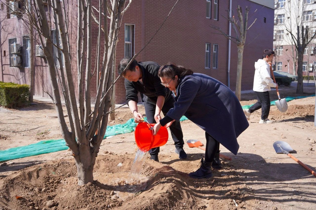 校领导与师生们一同挥锹铲土,有的扶苗填坑,有的培土夯苗,有的浇灌树苗,干的热火朝天,共同培育这春日的第一抹新绿。
