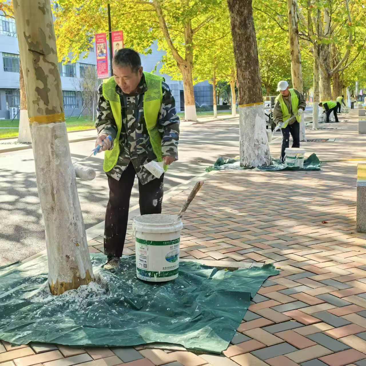 树干涂白“穿新衣”。为增强树木的御寒和抵抗病虫害的防护能力,绿化养护人员给绿化树木刷上一层涂白剂,并对每棵树木标定基准线和标准高度,做到高度一致、涂白均匀。