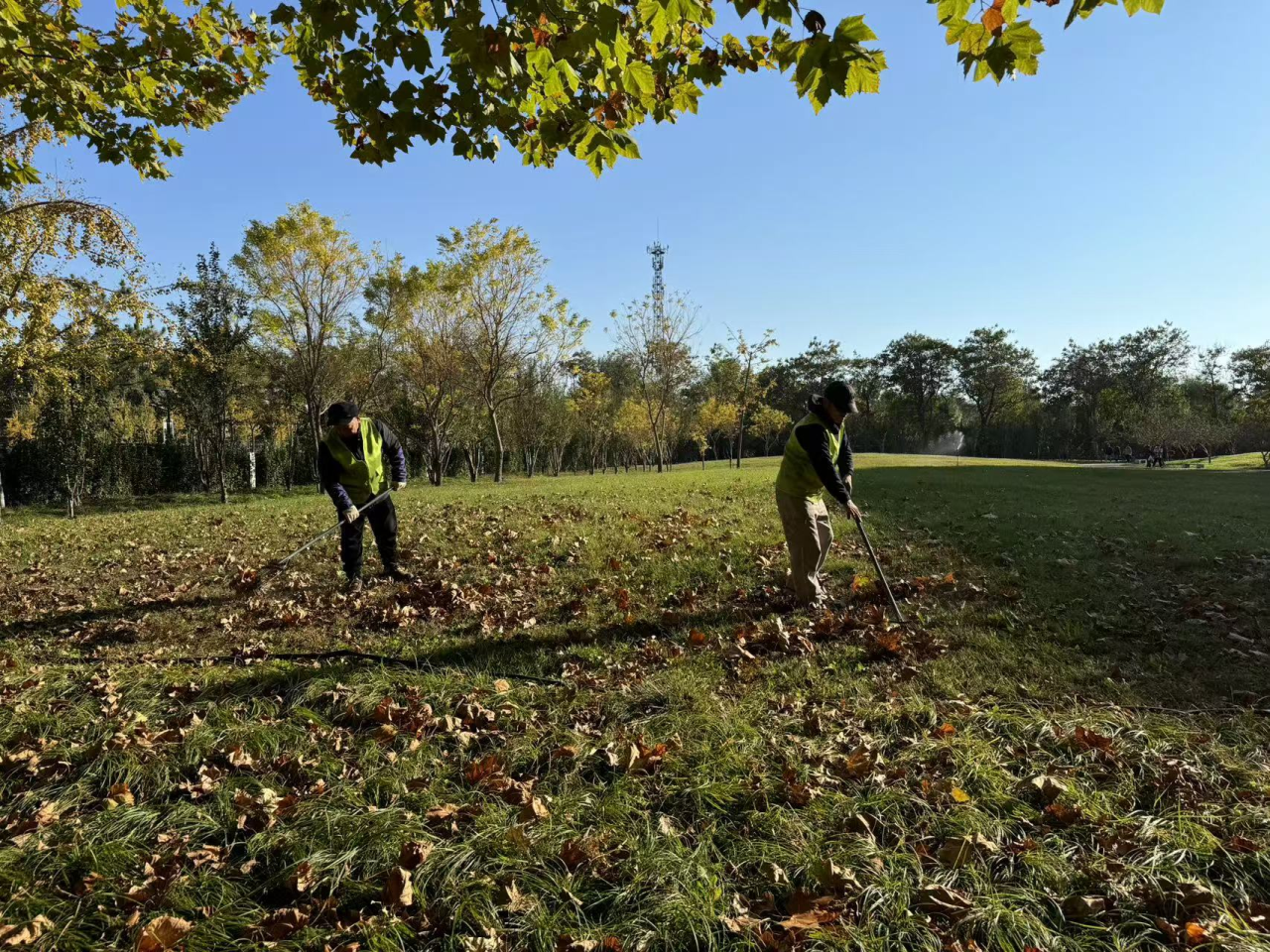 清理落叶“除隐患”。秋季落叶既影响校园景观环境,还存在灌水不畅和消防安全等隐患,后勤绿化团队利用风机、铁锹,耙子、扫把等工具对绿地内的落叶、枯枝进行全面清理,确保清理无死角、落叶无堆积。