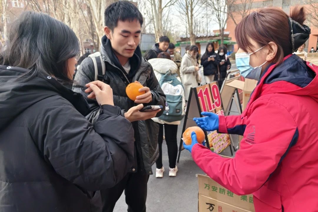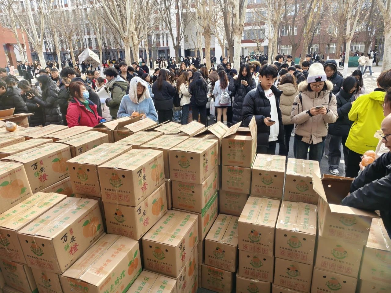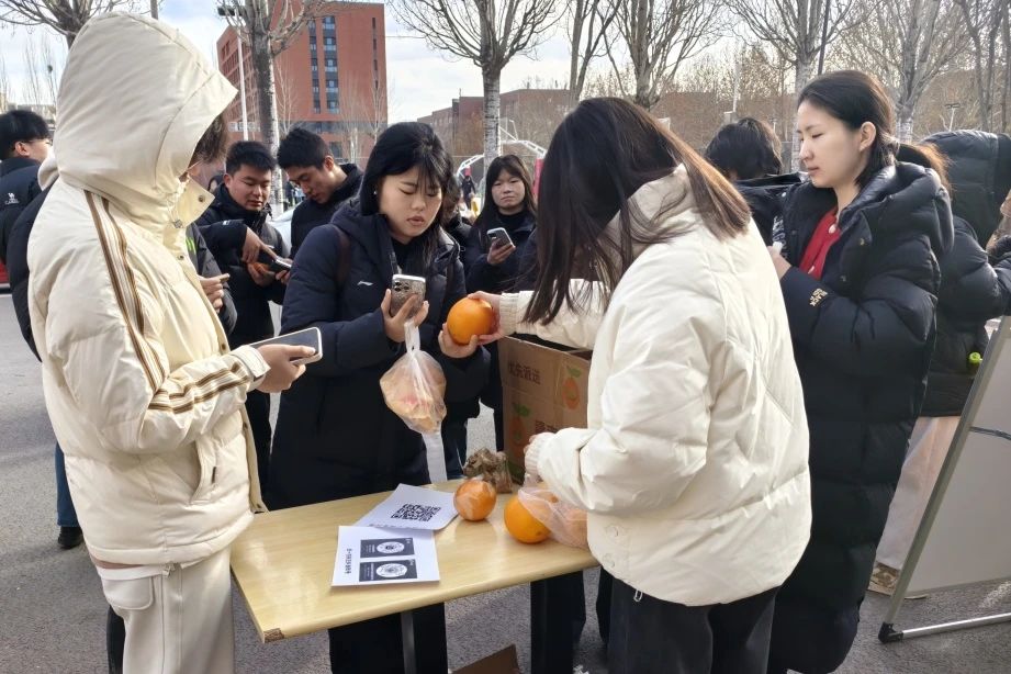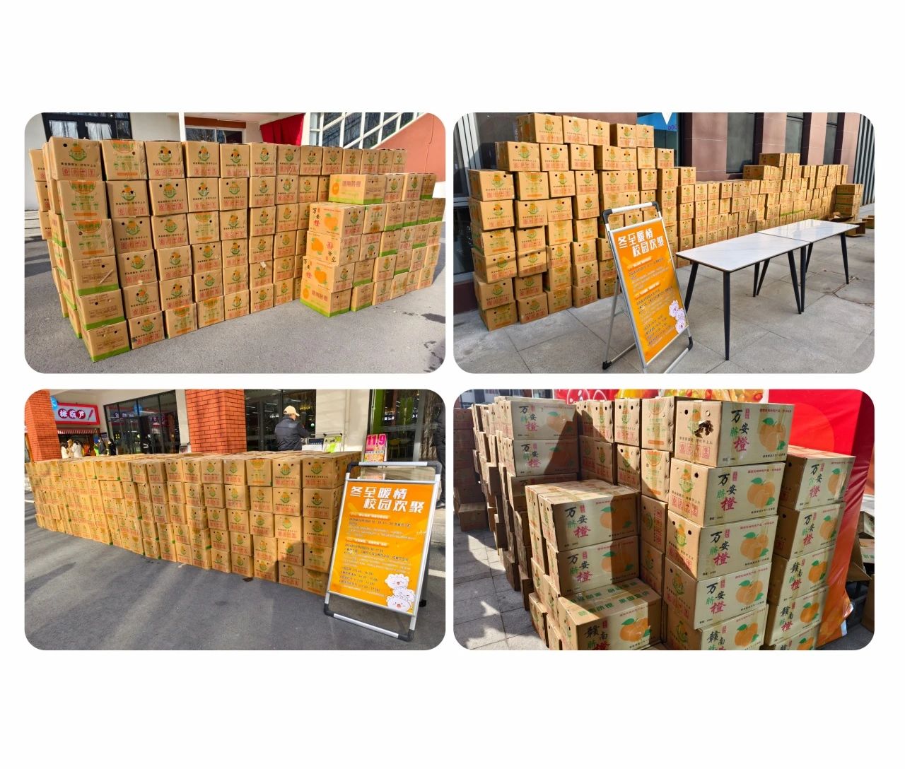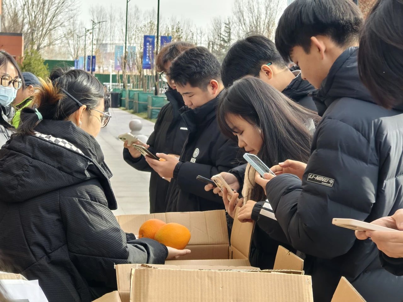 尽管是在冬季,树木凋零,但活动现场却充满了生机。同学们的活力和橙子的鲜亮颜色让整个场景充满了生命力,仿佛春天提前到来。
