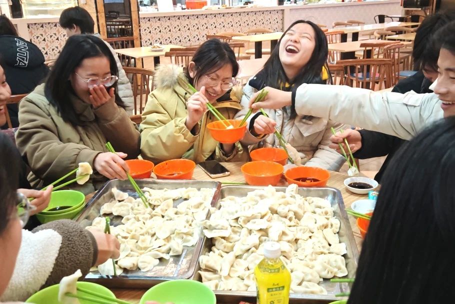 随着一盘盘形态各异的饺子摆满了餐桌,同学们迫不及待地拿起筷子,夹起一个热气腾腾的饺子,满足的咬上一口。