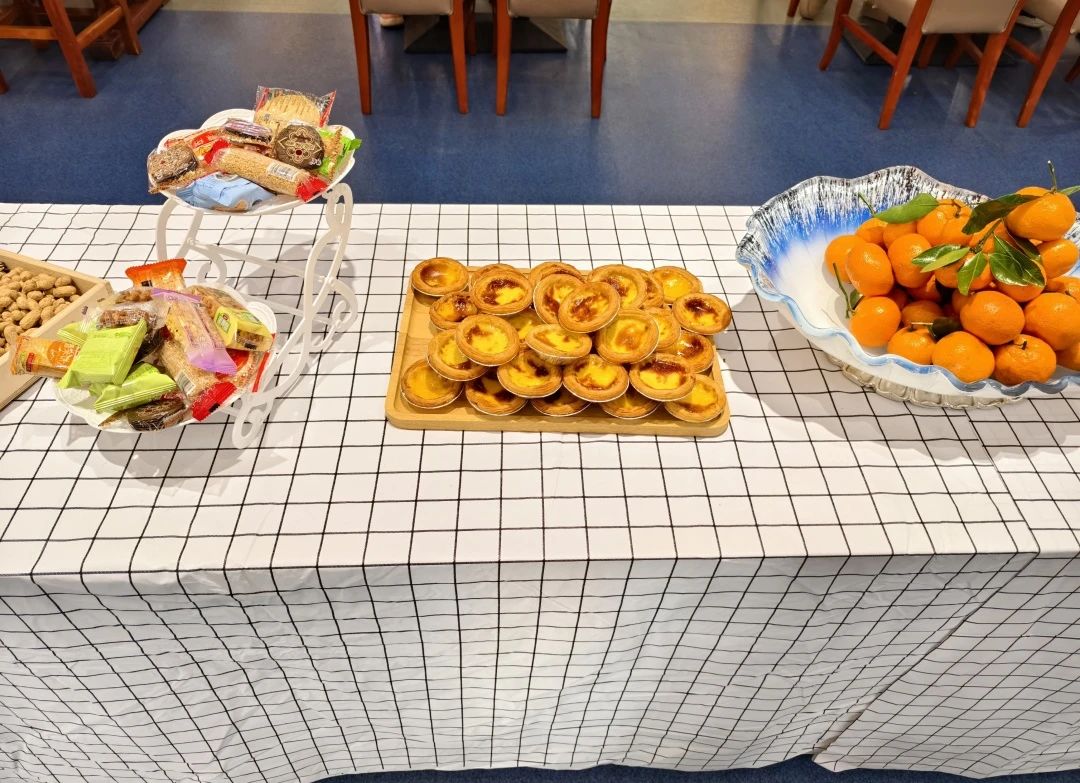现场欢声笑语不断,大家一边喝着饮料,一边吃着水果零食,热烈的气氛驱散冬日的寒冷;