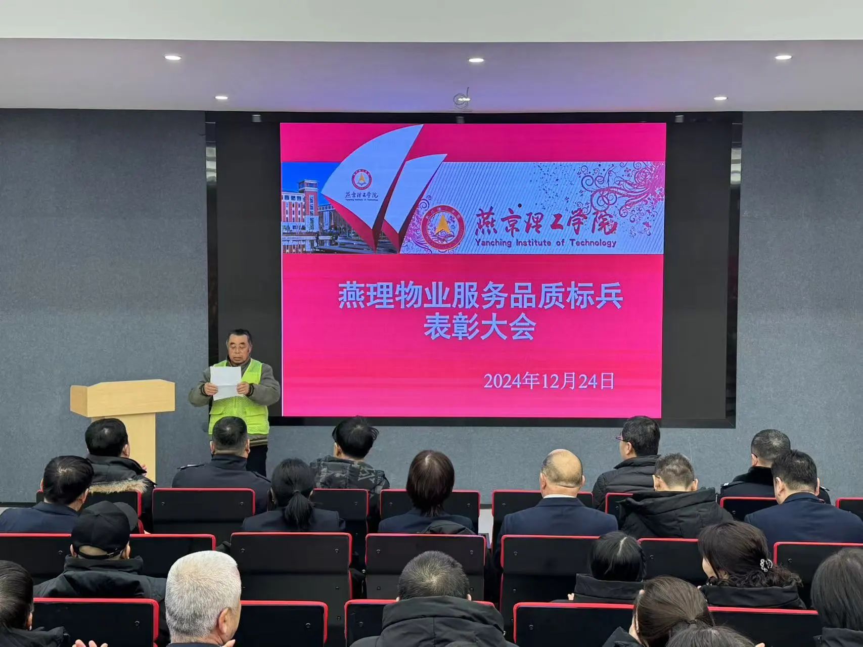 为表彰先进优秀典范,弘扬员工爱岗敬业精神,进一步增强员工的向心力与凝聚力,12月24日上午8:30,燕京理工学院在M-101召开服务品质标兵表彰会。后勤资产处安全处相关部门负责人及物业全体服务保障人员参加了此次会议。