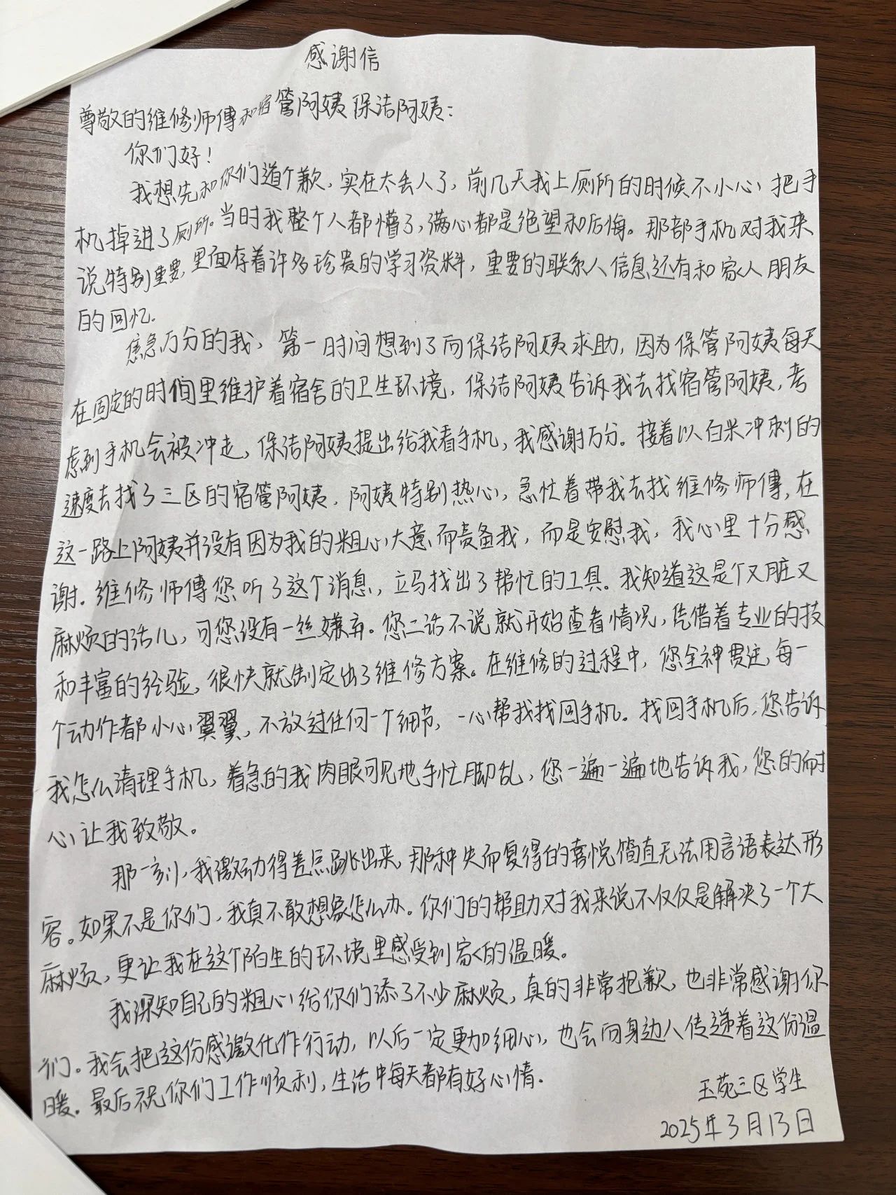 玉苑三区的马同学在上厕所时不慎将手机掉入了马桶,焦急万分之际,保洁阿姨齐桂丽闻声赶来,一边安抚同学的情绪,一边联系楼宇中心,宿管阿姨杨玉珍及时赶到并第一时间通知了维修师傅。维修师傅刘晓龙没有丝毫耽搁,立刻带着专业的工具赶到了现场。他仔细观察了马桶的结构和手机掉落的位置,凭借多年的经验,迅速制定了一个稳妥的救援方案。在确保安全的前提下,他小心翼翼地将工具伸入马桶,凭借着精湛的技艺和丰富的经验,终于成功地将手机从马桶中掏了出来。同学接过失而复得的手机,万分感谢。“同学别客气,这是我们应该做的,以后遇到什么问题,尽管来找我们!”一句句质朴真诚的话语,让同学感受到家一般的温暖。