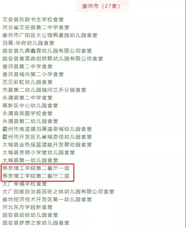 按照《河北省校园食品质量安全水平提升三年行动计划(2019-2021年)》工作目标和任务要求,三年来我校持续对标“A级标准”对校内食堂进行不断建设和优化,经廊坊市、三河市两级监督部门动态评定和河北省市场监督管理局先后两轮严格现场检查和评定,2021年12月16日我校第二食堂被河北省市场监督管理局评定为2021年度省级校园食品安全标准食堂,是三河市唯一获评的单位,也是廊坊市两个获评此荣誉的高校之一。