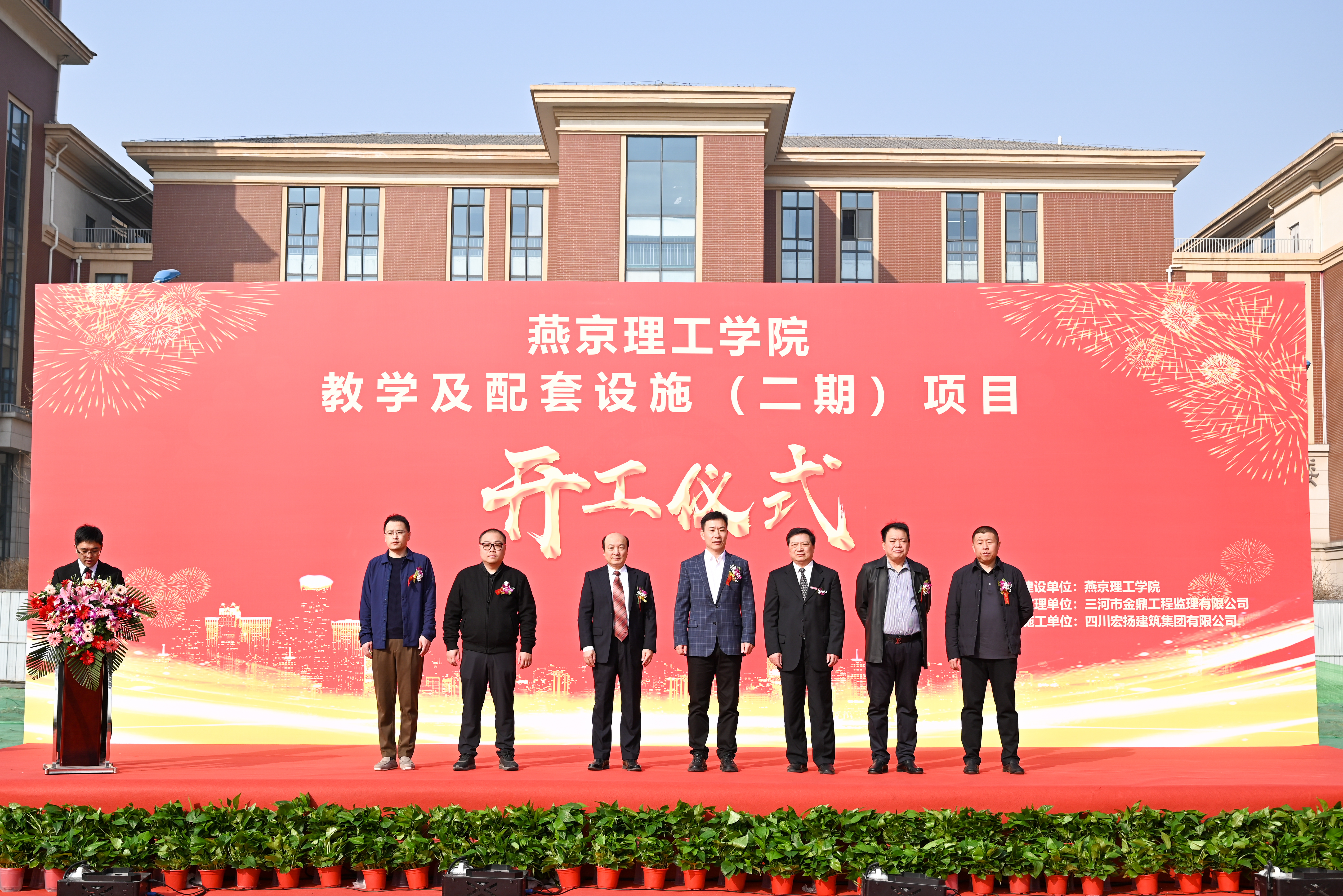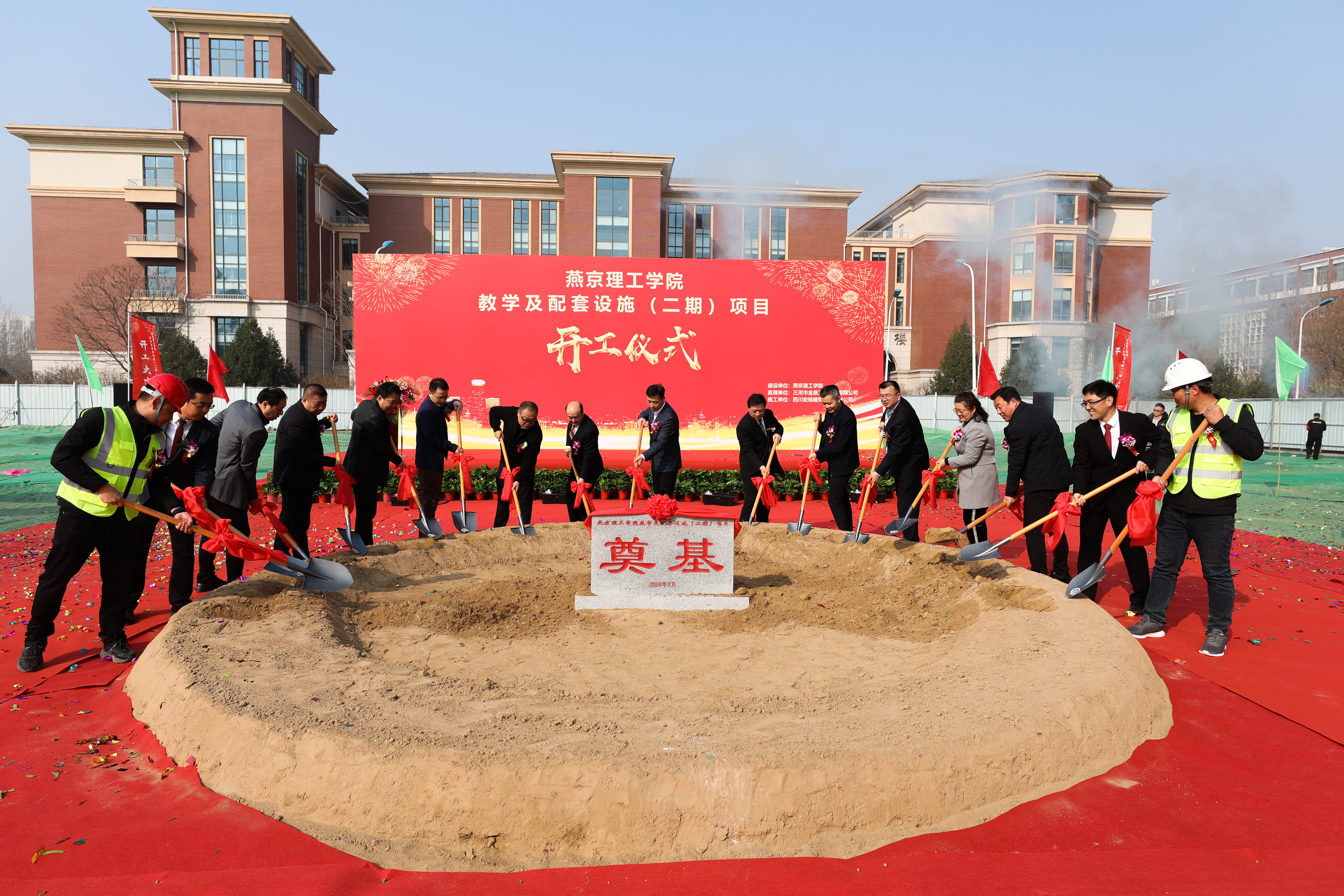 燕京理工学院,这所始终秉持开放办学精神,致力于实施“高端化、全球化、个性化”发展战略的高等学府,于3月15日上午9点16分,在综合楼西侧新建项目工地上,隆重举行燕京理工学院教学及配套设施(二期)工程奠基典礼,出席奠基典礼的领导和嘉宾有四川宏扬建设集团有限公司总经理朱川、三河市金鼎工程监理有限公司董事长吴雷、中冶地建设集团(三河)建筑设计咨询有限公司项目负责人焦明旭,燕京理工学院全体校领导,及学校各部处负责人、二级学院师生代表。由基建处处长曹贺鑫主持奠基典礼。