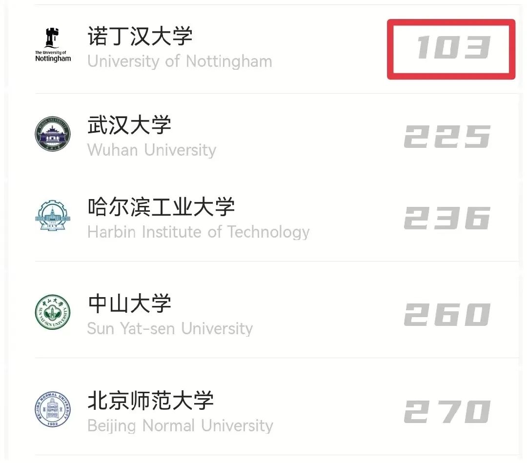 诺丁汉大学在世界排名中位列2022QS世界大学排名第103位。