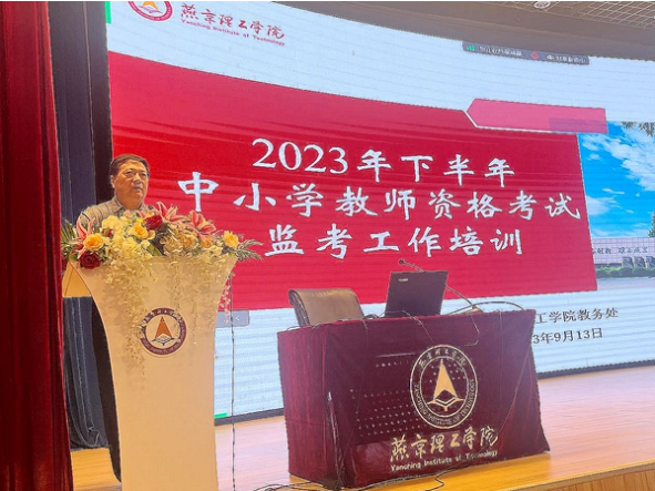 为确保2023年下半年中小学教师资格考试顺利进行,9月13日,教务处、安全处、后勤资产处、图文信息中心、学生处、学校办公室等相关人员在综合楼328会议室召开中小学教师资格证考试工作协调会。校长杨庚宇、全体考务人员及监考人员在报告厅参加了监考工作培训。