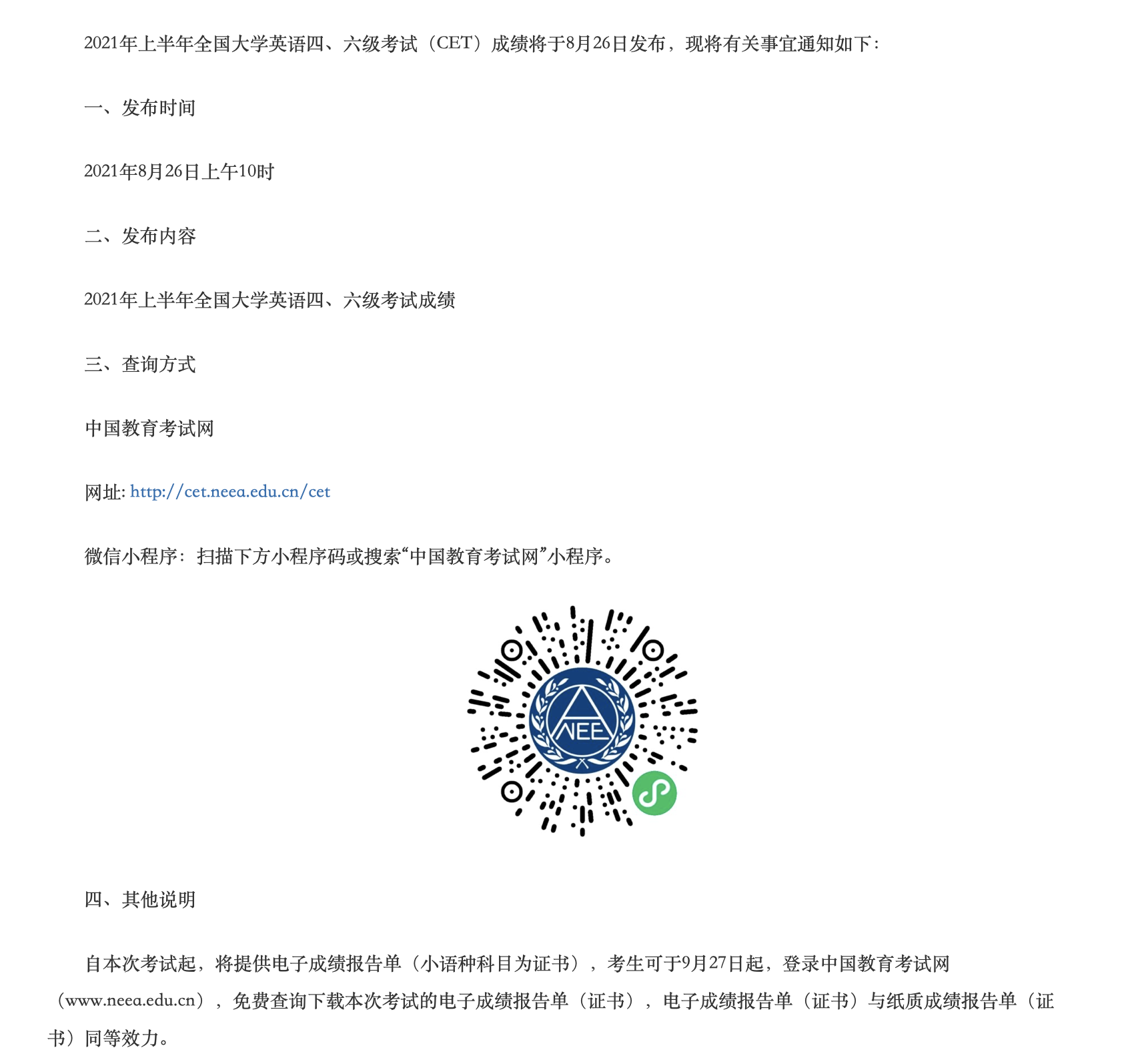 2021年上半年全国大学英语四、六级考试成绩发布通知