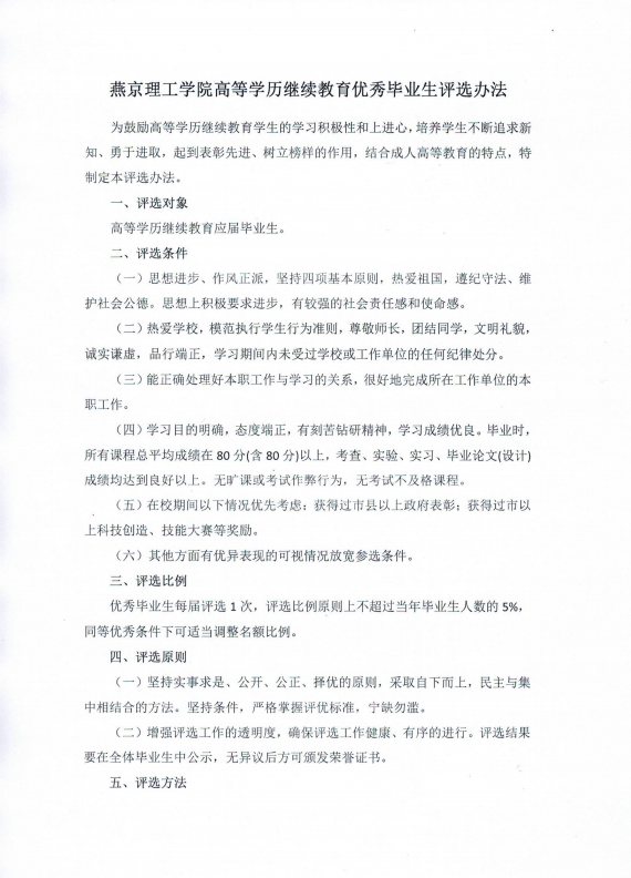 燕京理工学院高等学历继续教育优秀毕业生评选办法