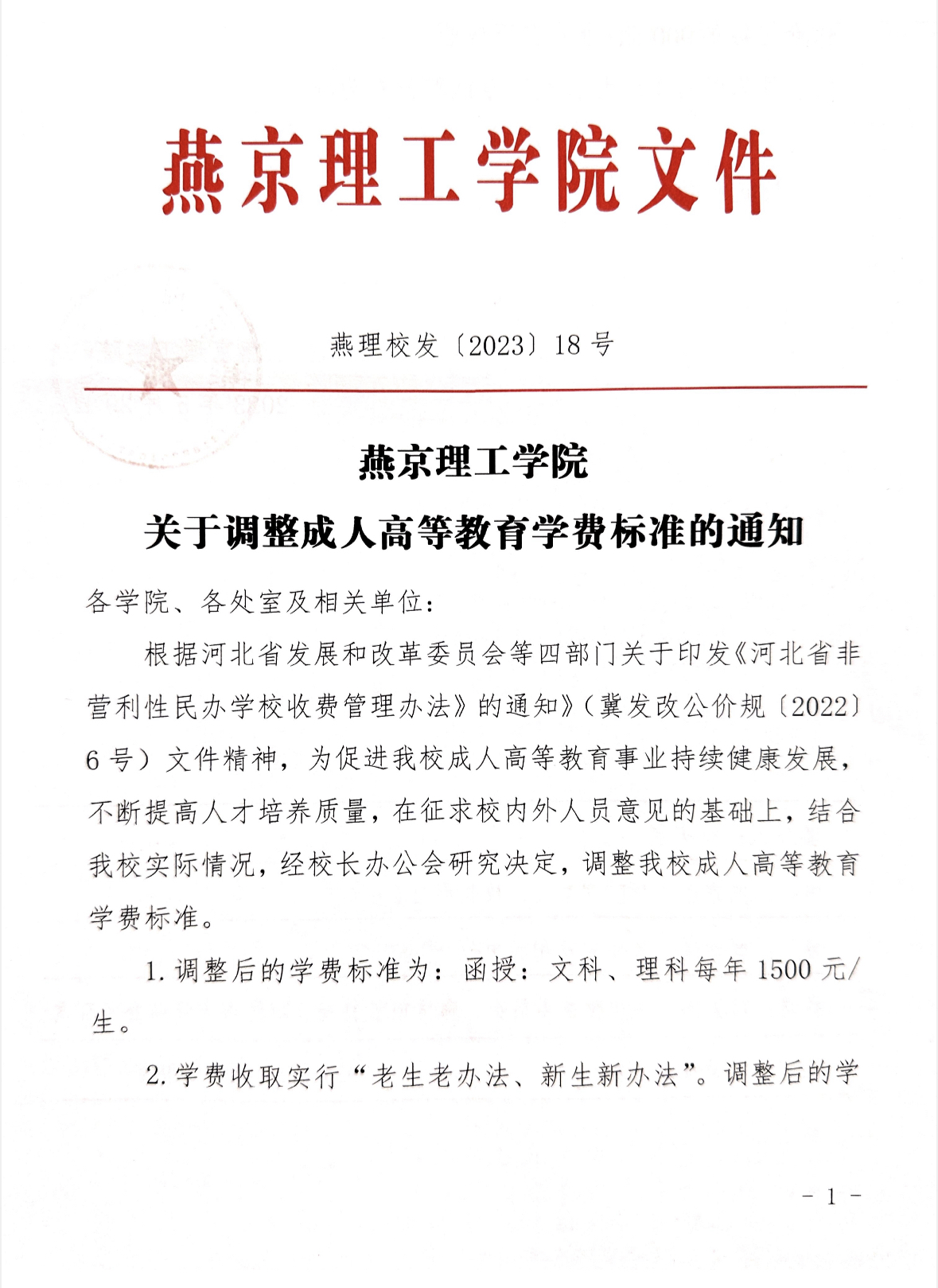 燕京理工学院关于调整成人高等教育学费标准的通知